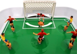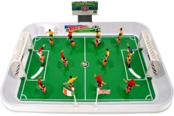 En la caja encontrarás 12 jugadores, campo, 2 porterías, pelota, tablilla de puntuación, postes y pegatinas de banderas: solo hay que desempaquetar y jugar.