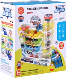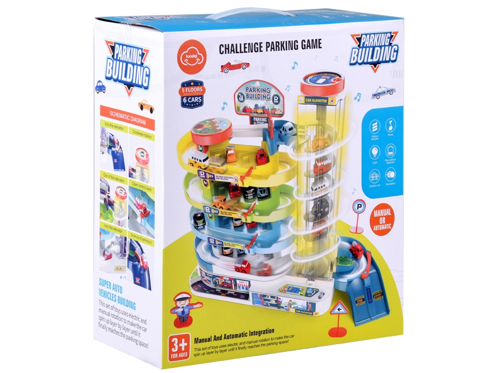 Garaje de estacionamiento de varios niveles para niños que ofrece ascensor eléctrico y manual, rampas en espiral y 6 cochecitos de colores. Incluye señales de tráfico, figura de guardia y pegatinas para un juego realista. Una excelente elección para desarrollar habilidades creativas y motrices de los niños.