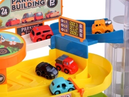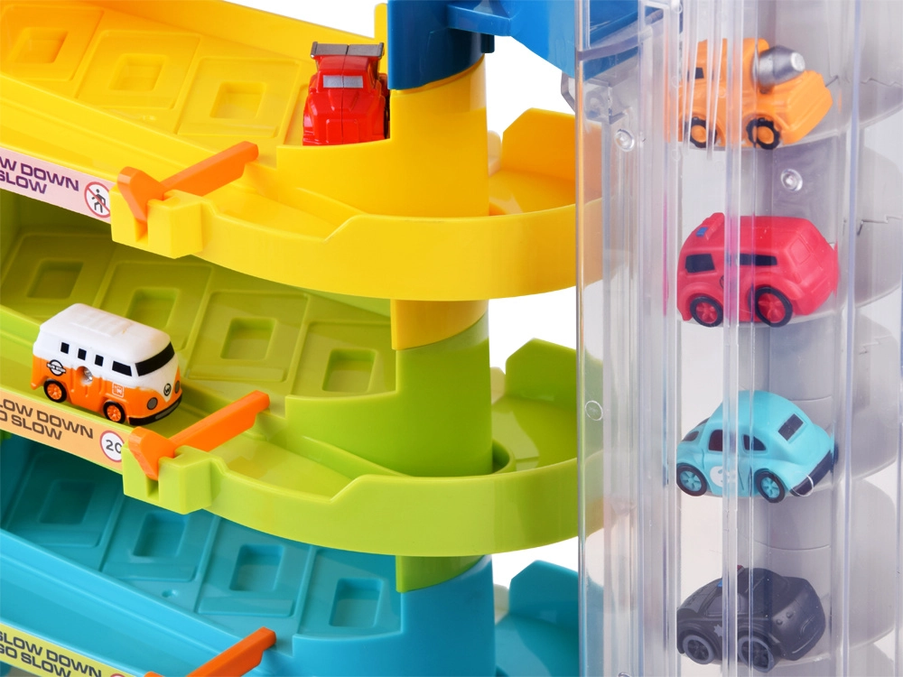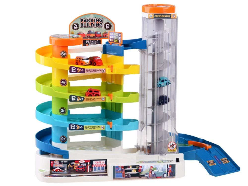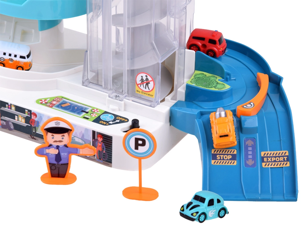 Este colorido garaje de plástico de cuatro plantas brinda mucha acción a los niños: los cochecitos pueden circular por las rampas en espiral y desplazarse entre los pisos mediante un ascensor transparente. El ascensor se puede controlar manualmente o de forma eléctrica insertando 3× pilas AA (no incluidas). Durante el funcionamiento del ascensor se encienden luces y suena música alegre.