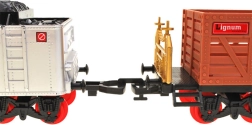 La locomotora negra con ruedas rojas se ilumina, emite sonidos y, tras añadir agua, realmente expulsa humo por la chimenea: una experiencia como en los ferrocarriles de antaño.
