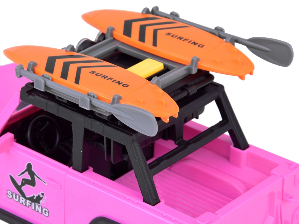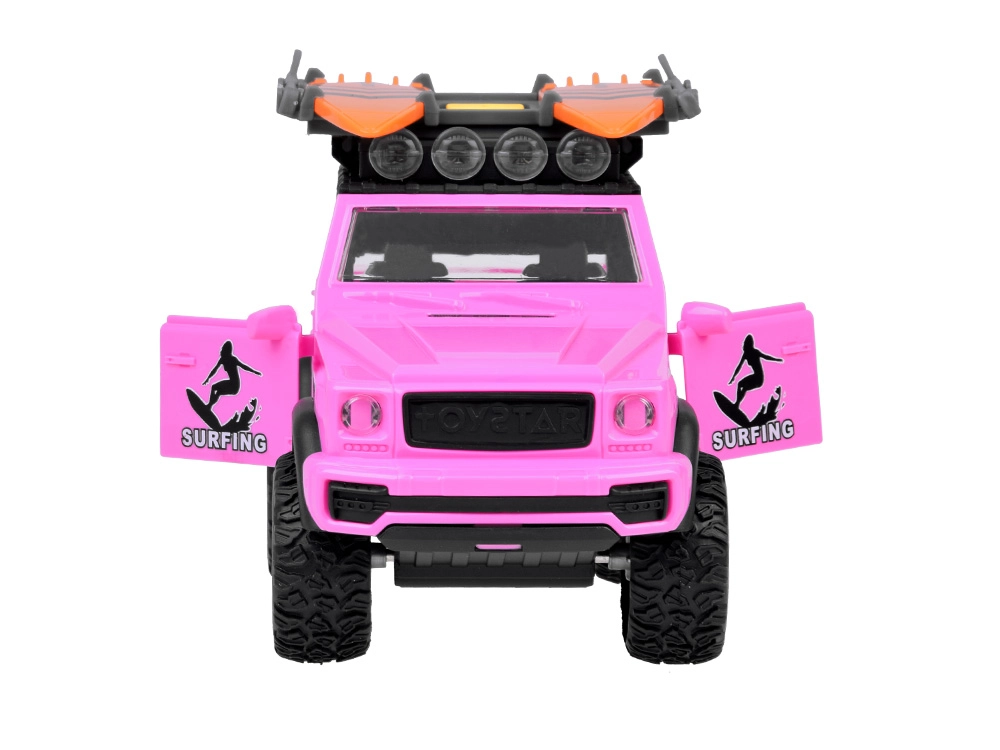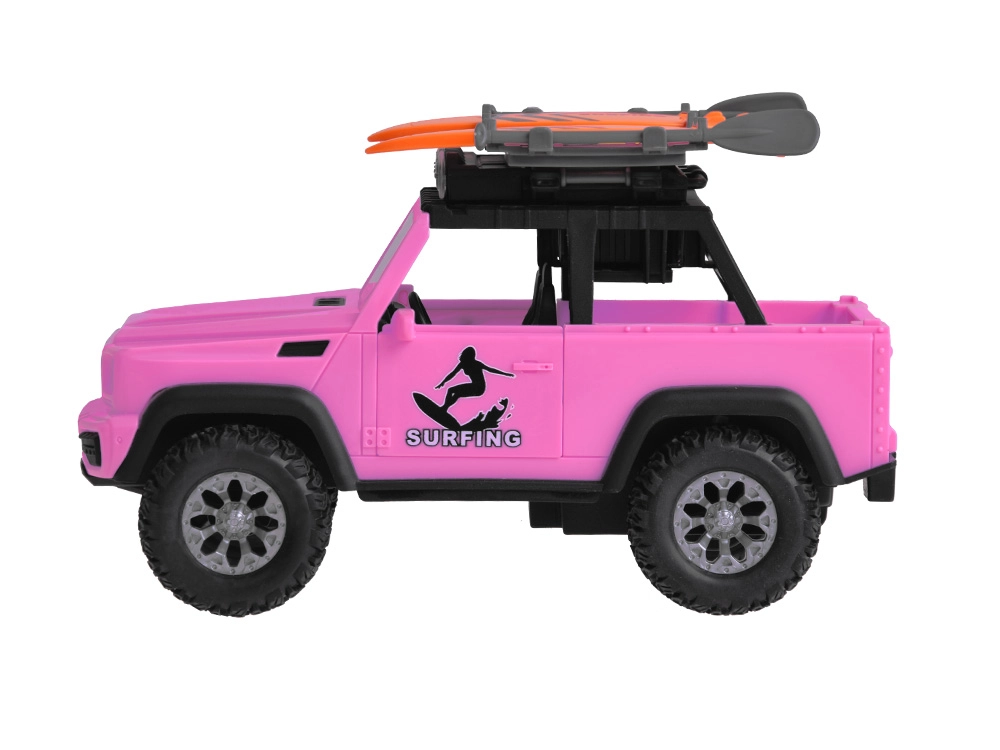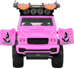 El elegante todoterreno rosa para pequeños aventureros ofrece efectos de luz y sonido, puertas abatibles, tapa del maletero abatible y grandes ruedas de goma con dibujo marcado. En el techo encontrarás un portaequipajes con dos tablas de surf y un panel luminoso para un juego aún más realista.