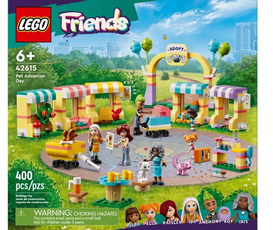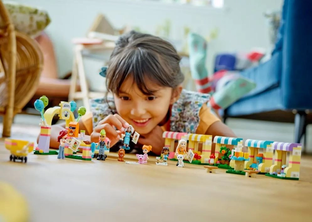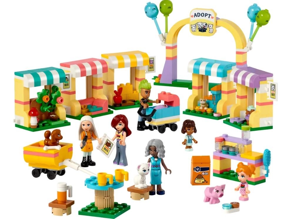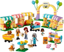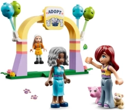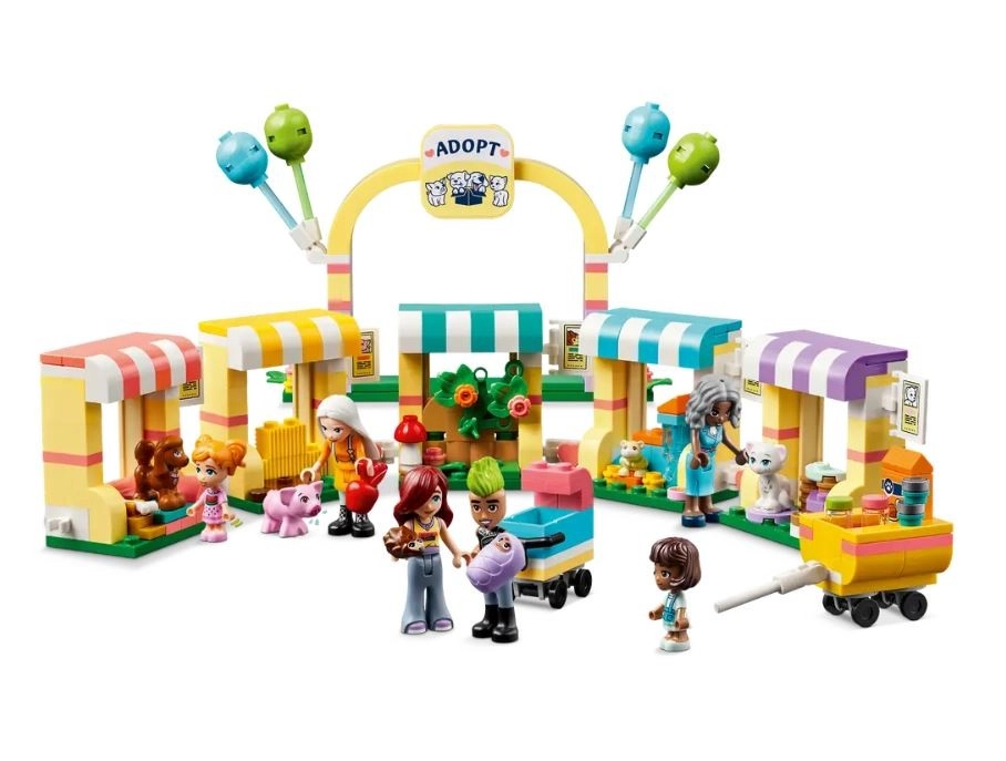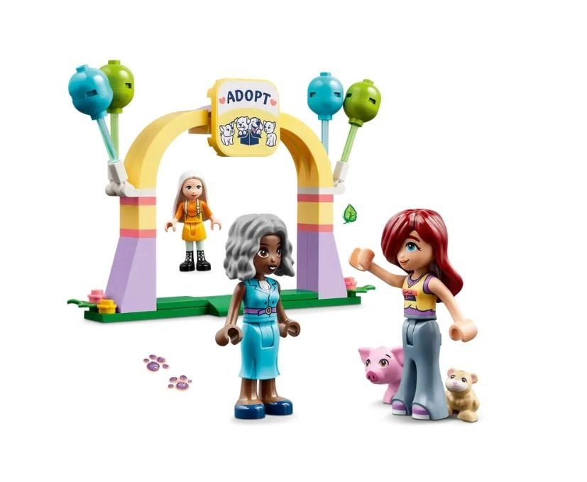 Puestos de colores, un arco con el letrero “Adopt” y casitas para animales crean la auténtica atmósfera de un día de adopción. Los peques emparejan mascotas con sus nuevos dueños y se marchan con ellos en el remolque.