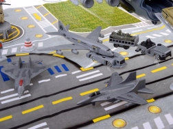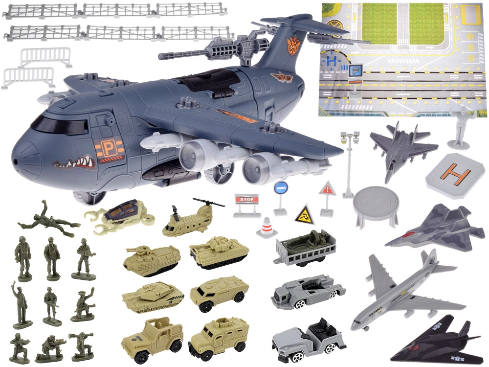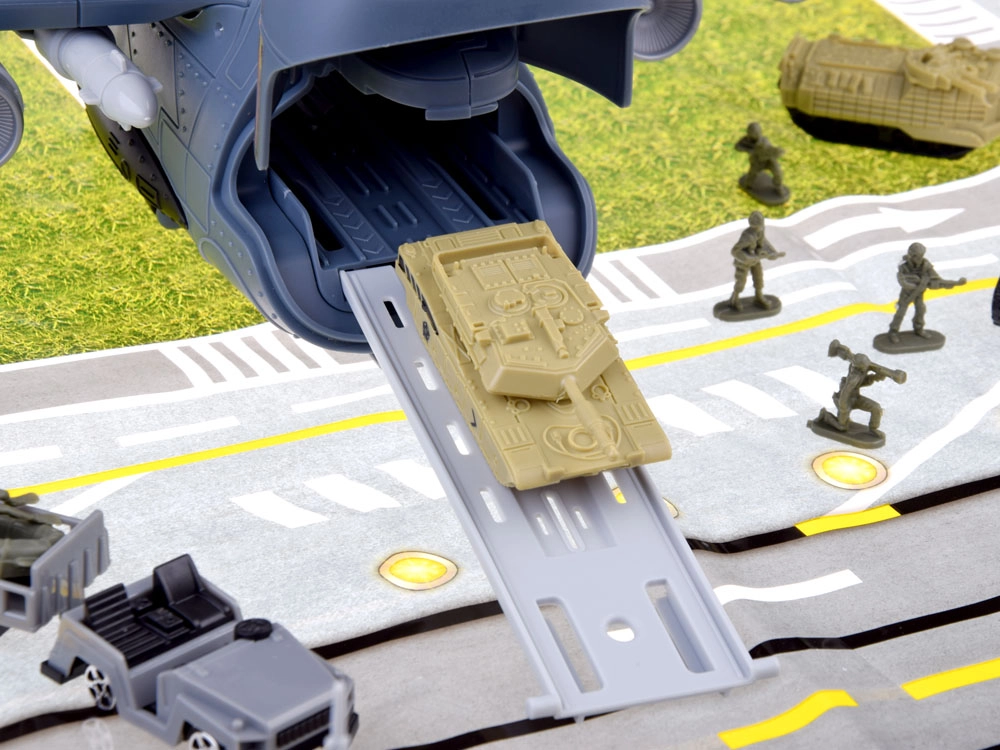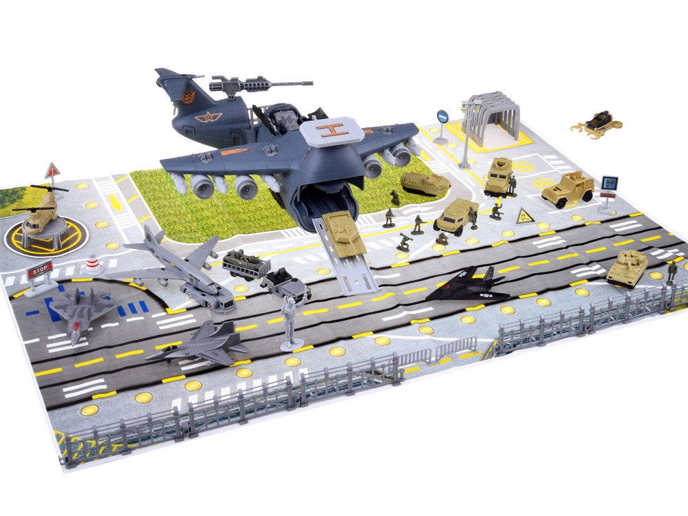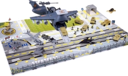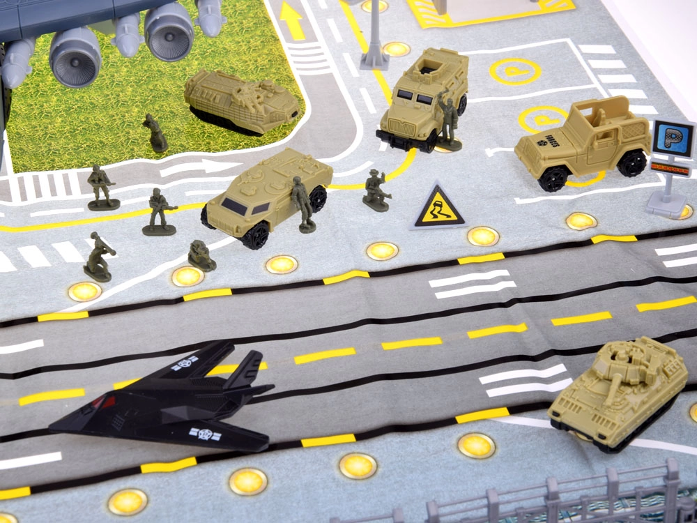 Esta base aérea militar detallada ofrece todo para una emocionante diversión de acción: un gran avión de transporte con cabina de pilotos abatible, rampa extensible y compartimento de carga trasero con espacio para el “desembarco” de vehículos. Incluye una alfombrilla de juego impresa con carreteras y pistas para que cada misión tenga lugar en un entorno realista.