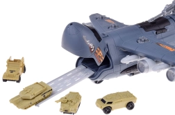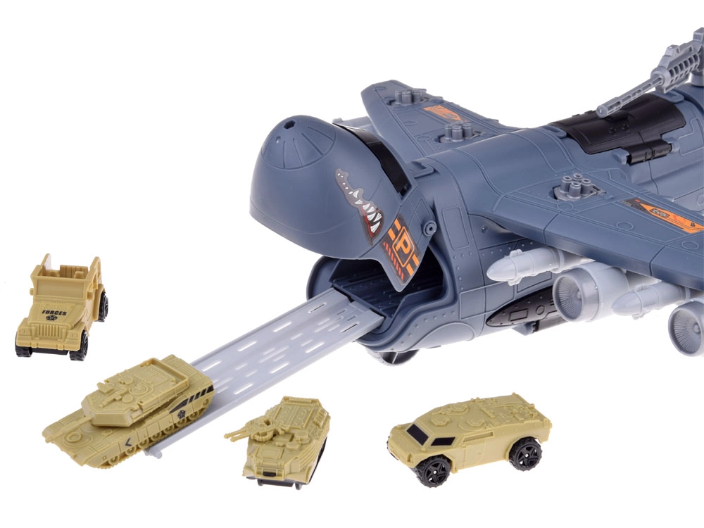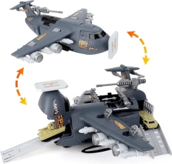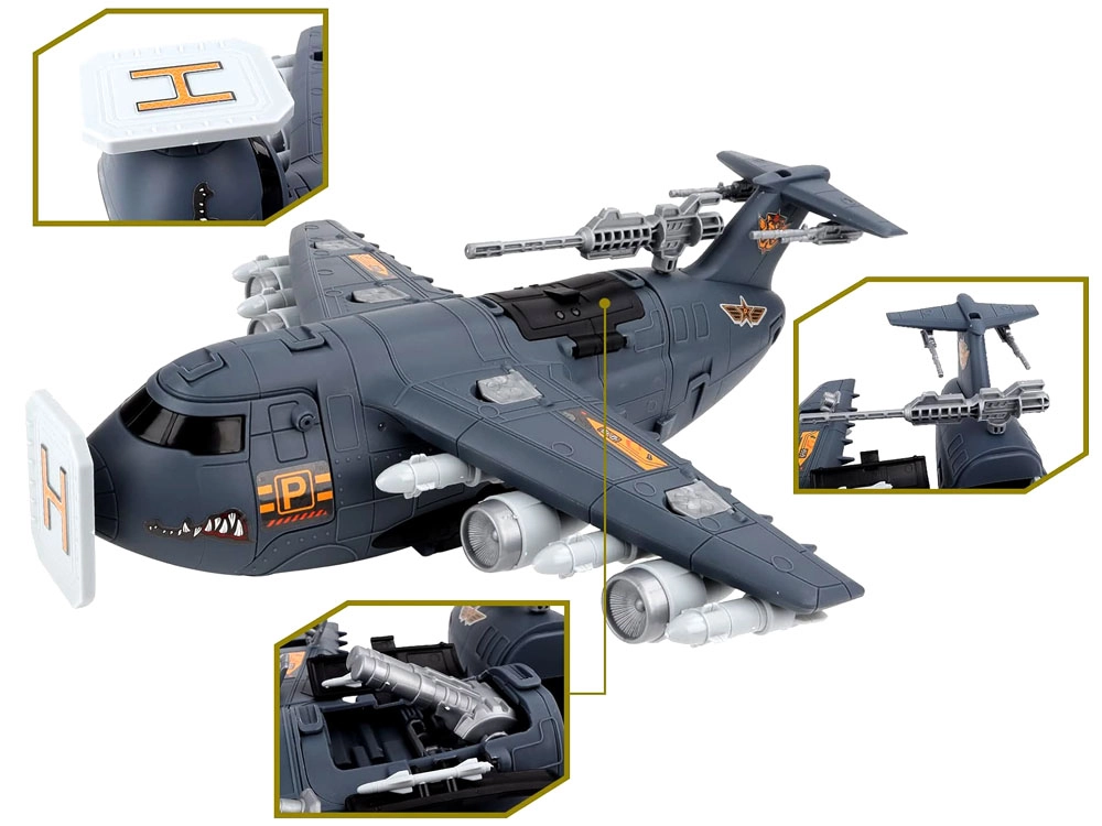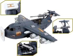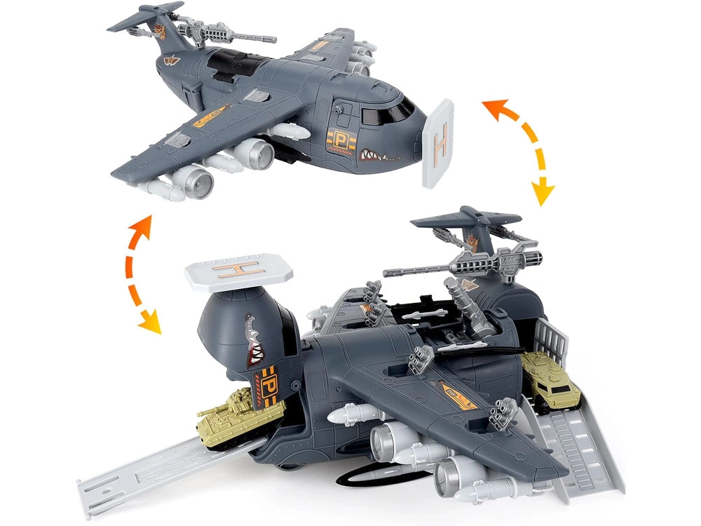 El avión está equipado con numerosas “armas” y cañones ocultos: en la parte superior del fuselaje hay un cañón extensible, y en las alas se pueden desplegar otros cañones. En el amplio set también encontrarás aviones de combate y de transporte, tanques, helicóptero, dron y vehículos militares, junto con figuras de soldados, señales, barreras y más accesorios. Todo ello fomenta el desarrollo de la imaginación, la motricidad fina y la creación de escenarios tácticos propios.