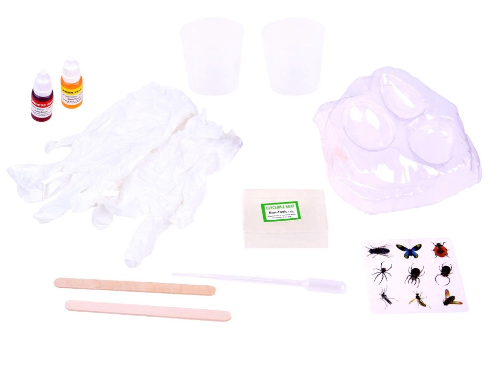 Incluye todo el equipamiento necesario para fabricar ámbar, como bases de jabón, colorantes y moldes.