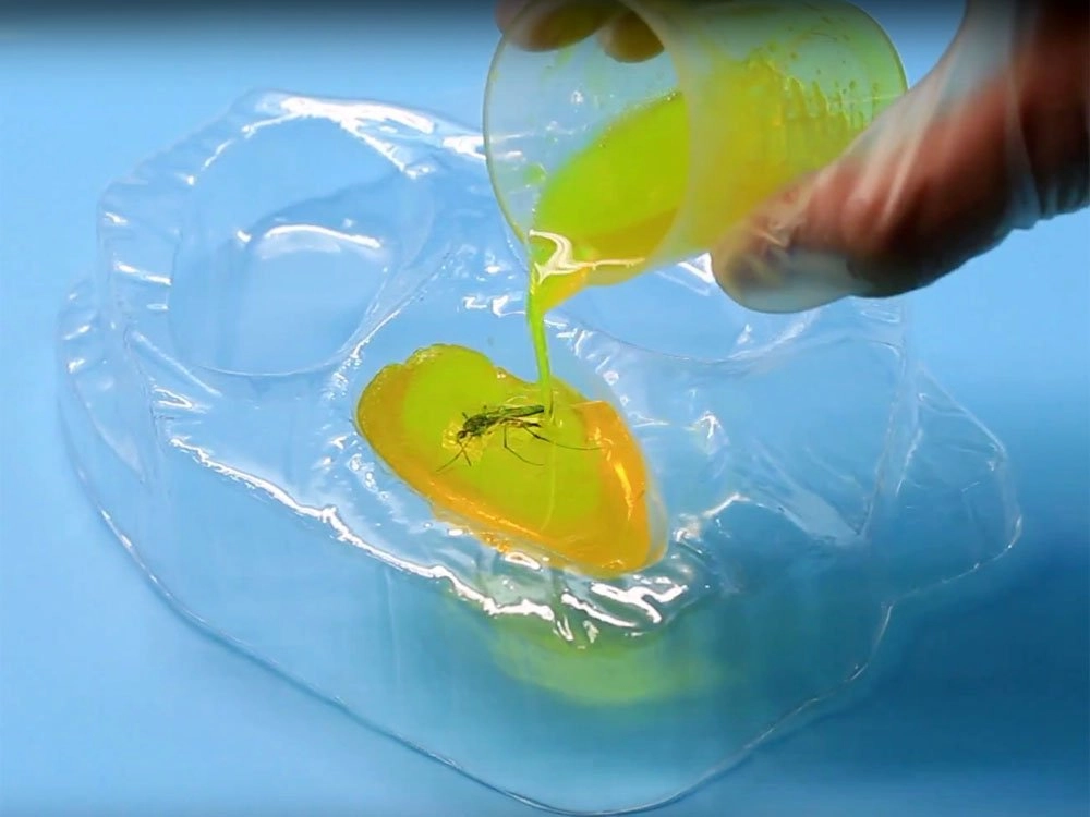 Muestra tu creación terminada: tu propio ámbar con insectos encapsulados y motivos decorativos.