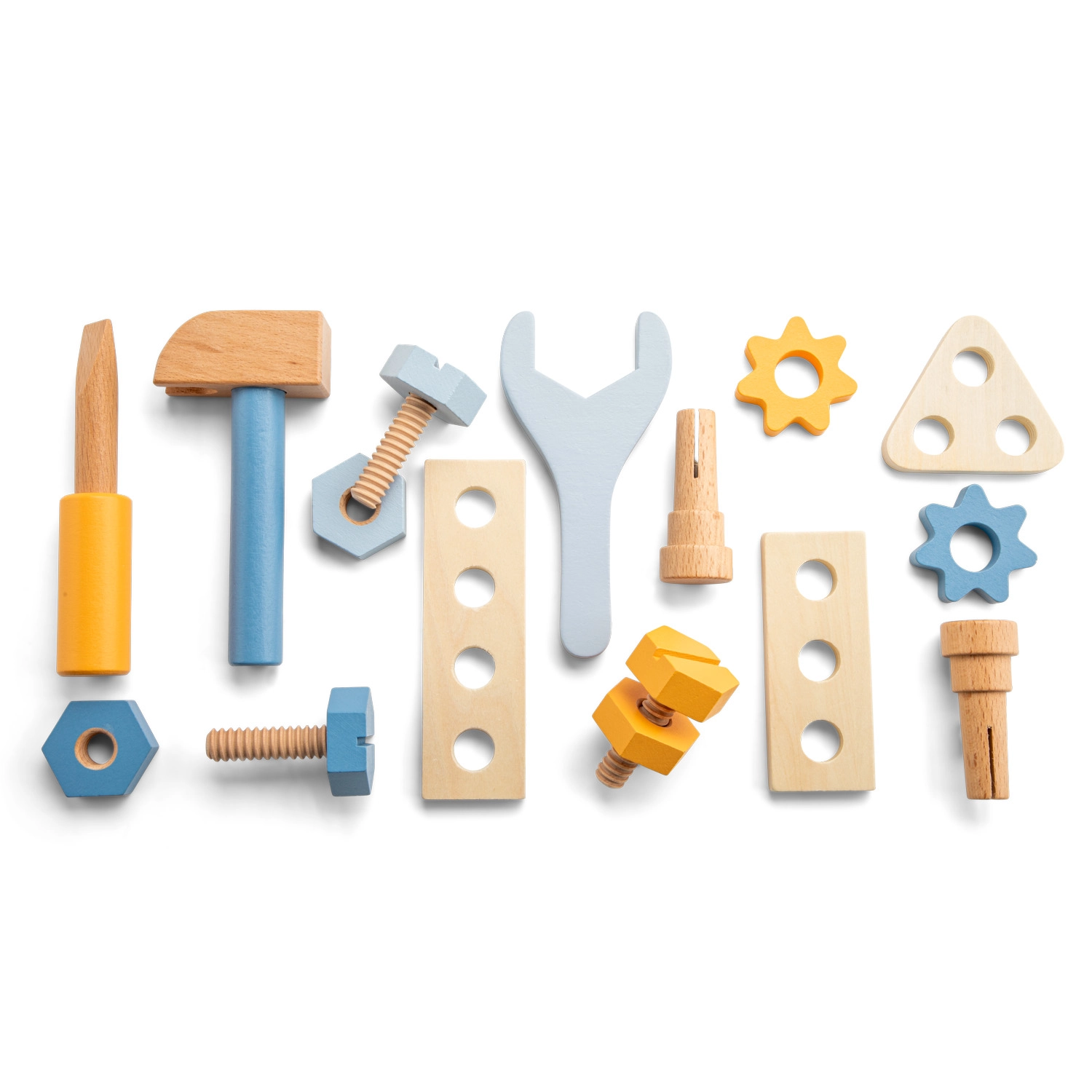 Incluye 16 piezas funcionales: martillo, destornillador, llave, clavos, tornillos y engranajes para infinitas posibilidades de juego. El producto está hecho de madera certificada FSC, por lo que es una opción sostenible para las familias y el planeta.