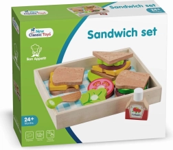 La caja de madera contiene todo lo necesario para “preparar” un delicioso almuerzo o picnic. Gracias a las piezas coloridas y de acabado realista, los niños pueden apilar diferentes combinaciones y crear sándwiches según su imaginación. El set es un excelente complemento para cocinitas y tienditas infantiles.
