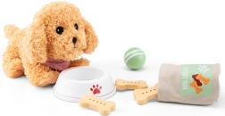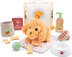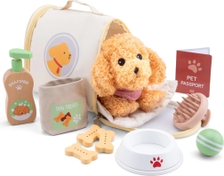 Contiene todo lo necesario para el cuidado del perrito de peluche. Detalles como la transportadora, el cepillo o las golosinas sumergen a los niños en el juego y les enseñan responsabilidad.