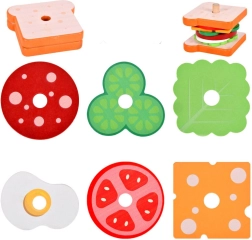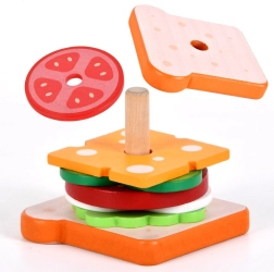 Divertido y educativo set de construcción de sándwich de madera con 8 piezas y 10 cartas de recetas que desarrolla la motricidad fina, la coordinación ojo–mano y la creatividad. Las piezas de madera de alta calidad son resistentes y seguras, ideales para niños a partir de 3 años.