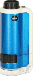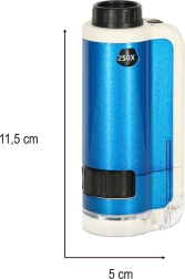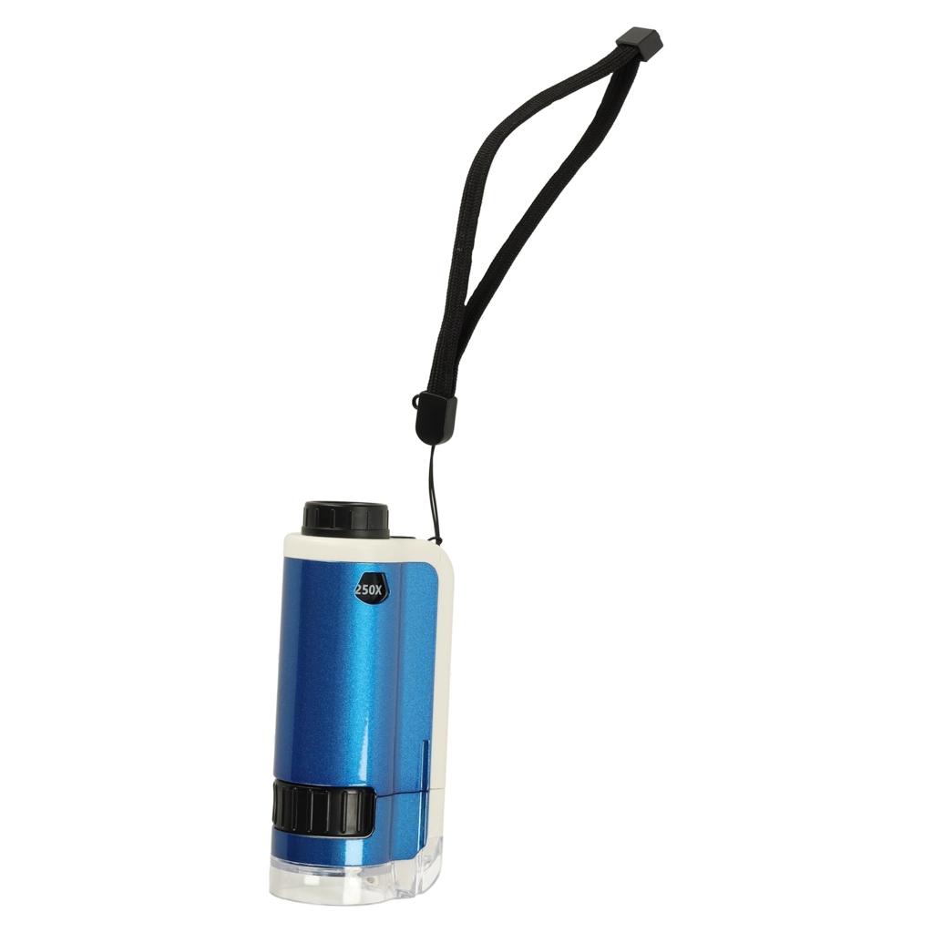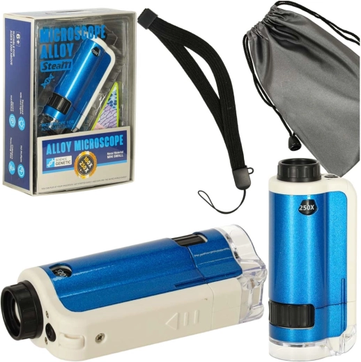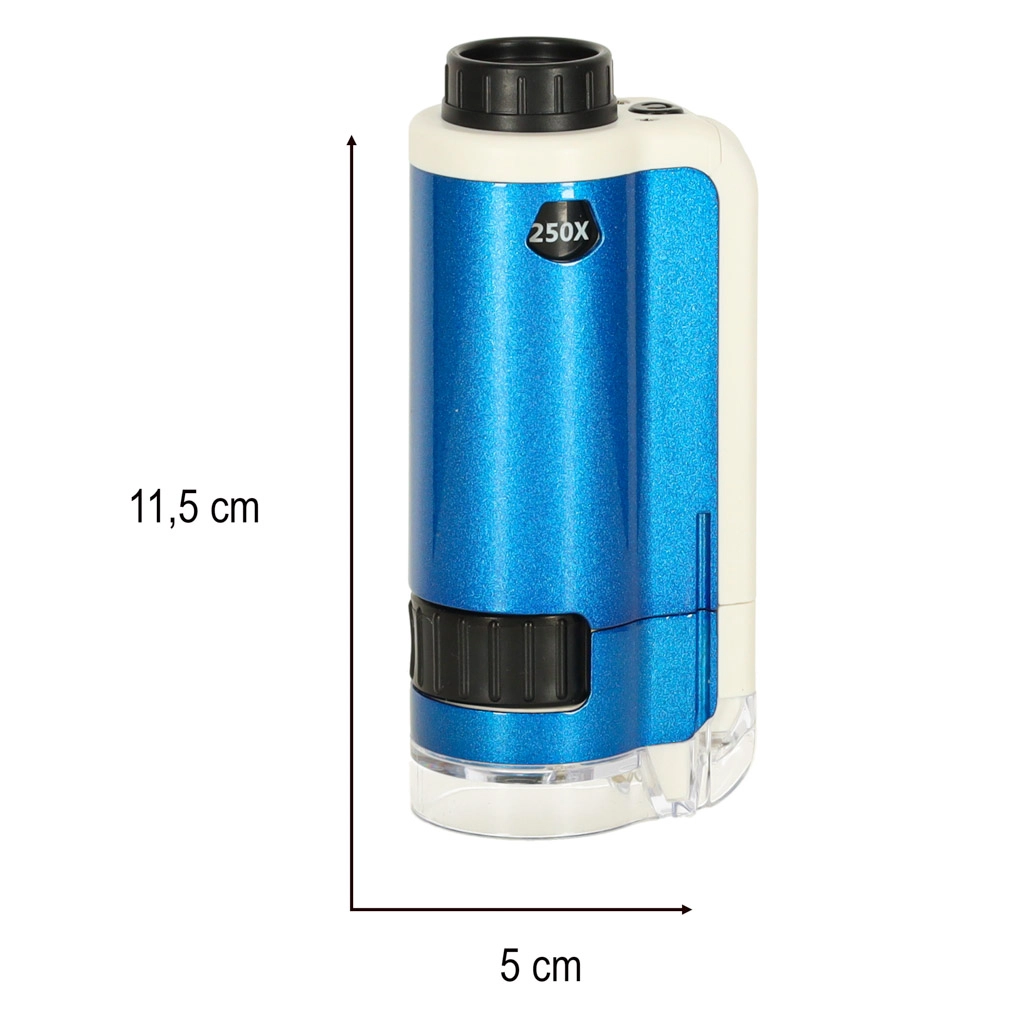 Descubre el fascinante mundo microscópico con el microscopio de bolsillo para niños. Este dispositivo permite explorar en detalle diversos objetos, como hojas, fibras textiles o cristales de sal, gracias al aumento doble (100x, 250x). El microscopio está equipado con un LED que garantiza una iluminación óptima.