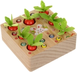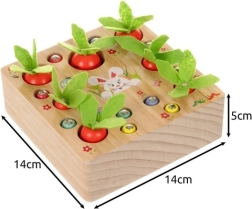 El juguete de madera KRUZZEL 2 en 1 aporta la alegría de aprender y jugar con un colorido diseño de huerto. A los niños les encantará imitar a los jardineros jugando con gusanos magnéticos y colocando zanahorias en los orificios correctos. El juego fomenta el reconocimiento de formas y colores, desarrollando así las habilidades sensoriales.
