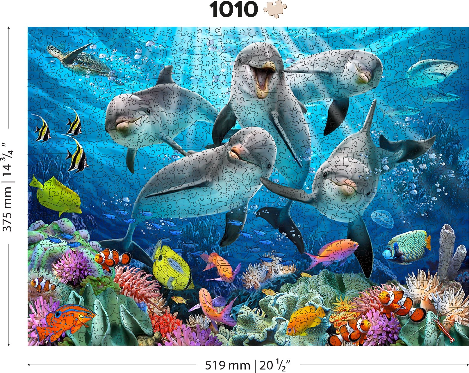 Descubre la magia de armar el rompecabezas de madera WOODEN CITY Delfines felices con 1010 piezas cortadas con láser. Originales piezas con forma de animales y finos detalles láser crean un desafío atractivo y diversión para muchas horas. El rompecabezas es eco‑friendly, sin envoltorios de plástico, hecho de tablero HDF de calidad y con bordes lisos y precisos para un montaje cómodo.