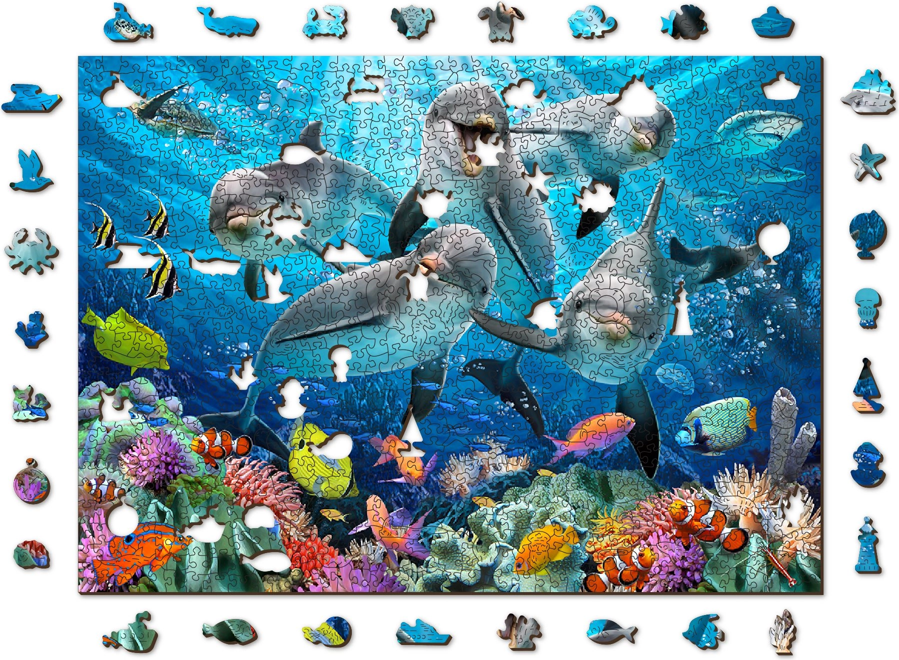 Disfruta de una experiencia única con este puzzle de alegres delfines. Gracias a las piezas especialmente diseñadas, algunas con forma de animales que pueden servir también como pequeñas figuritas, obtendrás un armado original lleno de sorpresas. El procesamiento preciso con láser garantiza detalles nítidos del motivo y bordes totalmente lisos sin astillas.