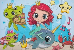 Hermoso rompecabezas infantil con un motivo de sirena y animales del mundo submarino. Contiene 30 piezas grandes para un montaje fácil; la imagen final mide 29 × 18 cm. Ideal como primer rompecabezas para niños, se entrega en una caja de regalo con asa para un transporte cómodo.