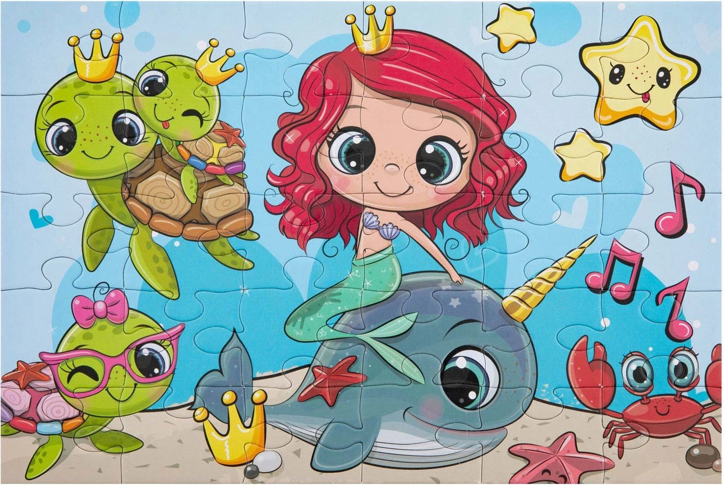 Descubre la magia del mundo submarino con un encantador motivo de sirena. El rompecabezas con 30 piezas grandes favorece la motricidad fina, la paciencia y el pensamiento lógico de los niños. Gracias a las piezas más grandes, es perfecto para los más pequeños, que disfrutarán al completar la imagen de 29 × 18 cm.