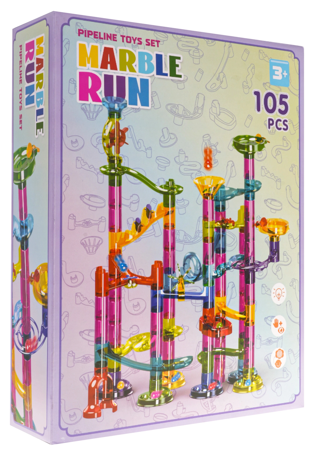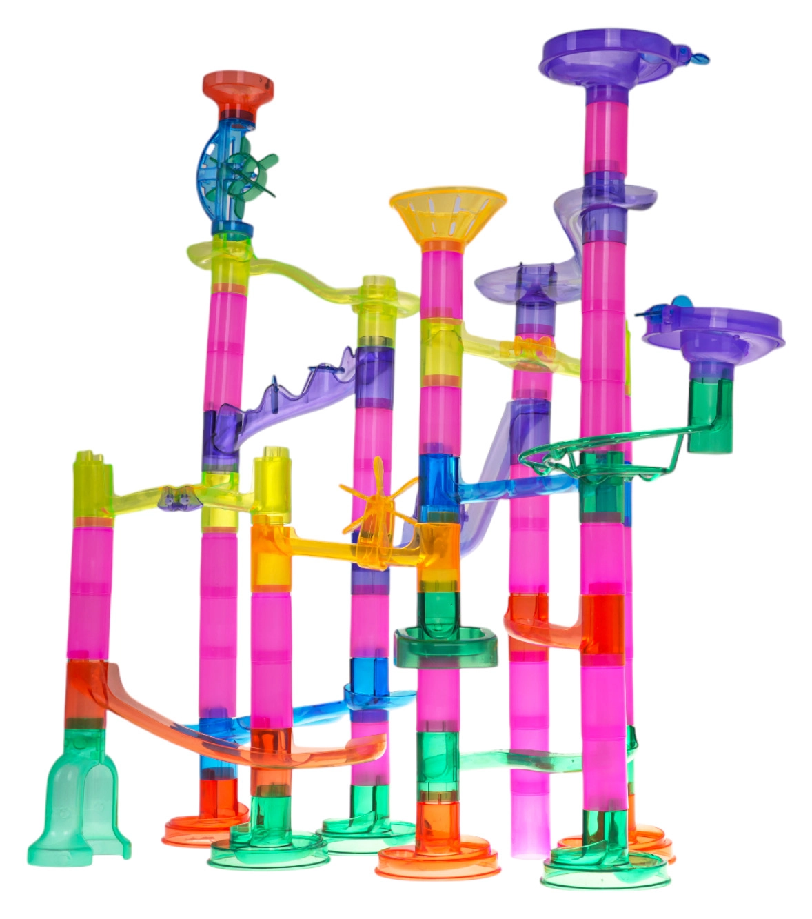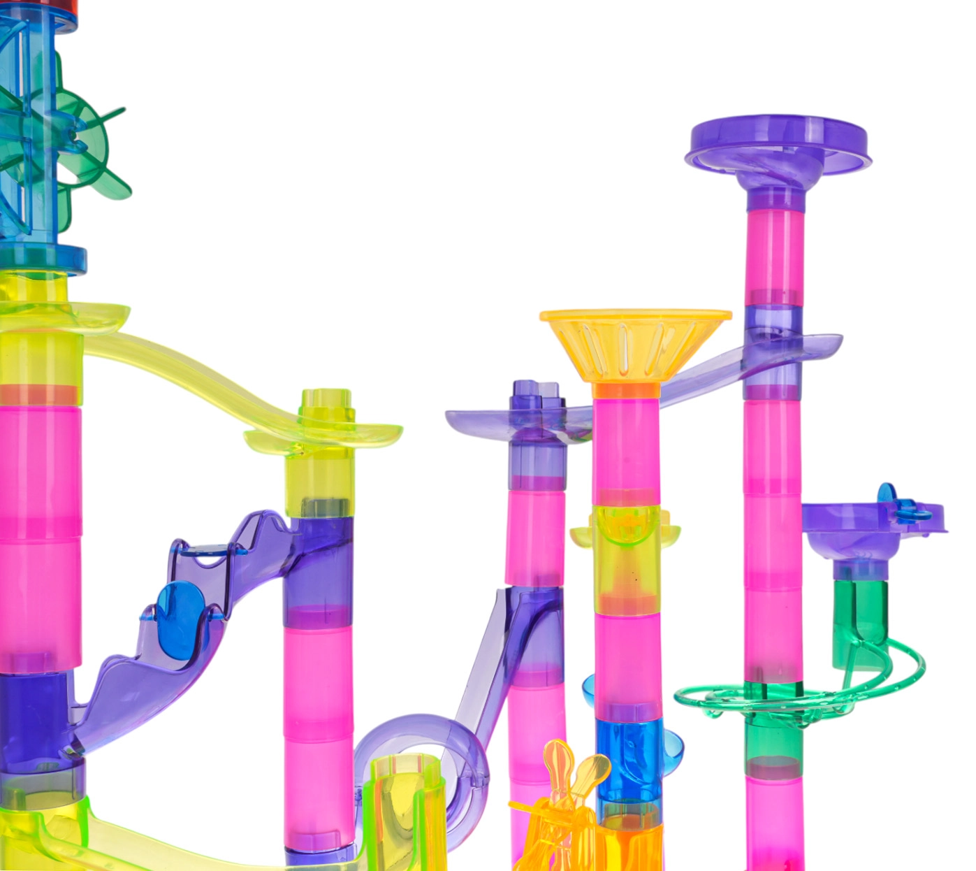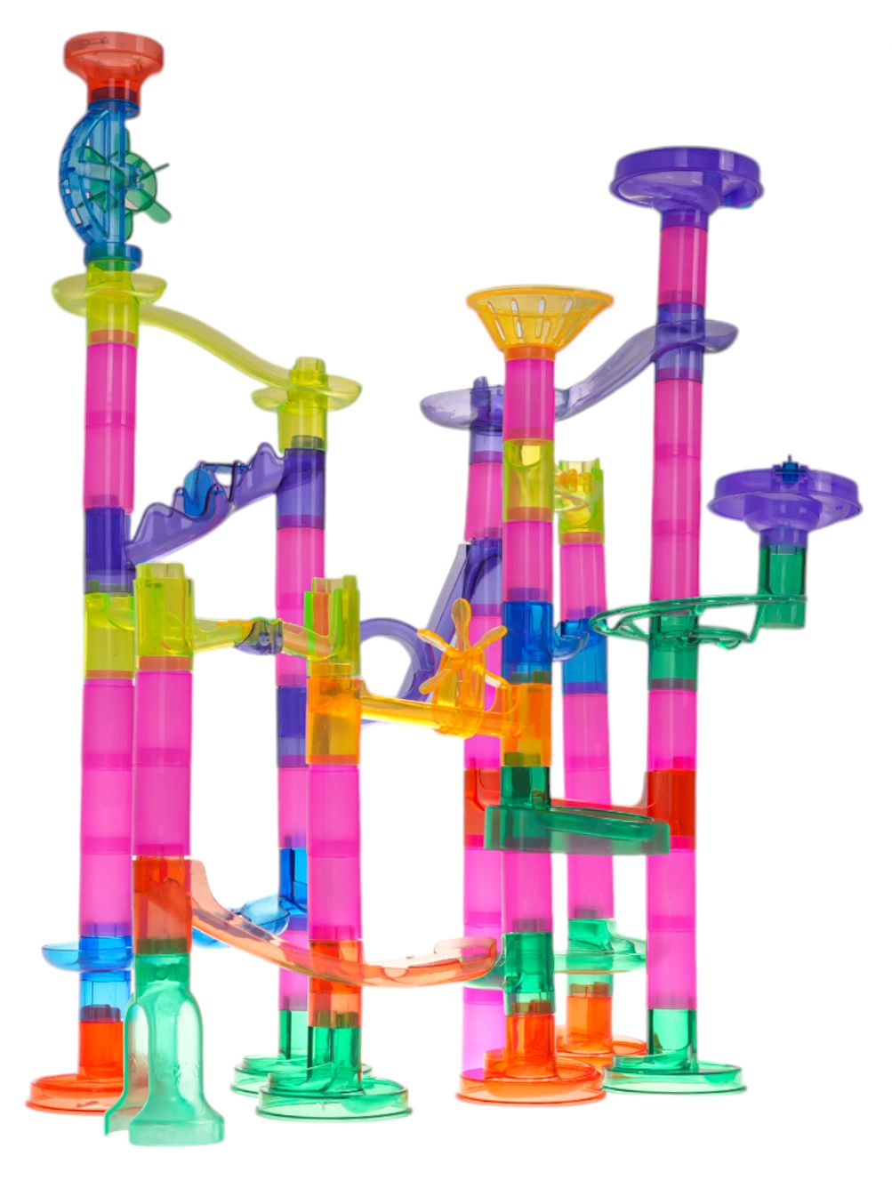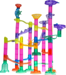 La colorida y estable pista de canicas de piezas transparentes ofrece a los niños la alegría de descubrir el movimiento, la gravedad y la relación causa-efecto. Los niños diseñan y construyen sus propias estructuras y luego observan cómo las canicas se deslizan por túneles, espirales y embudos. Las canicas parpadeantes con pilas añaden un espectacular efecto de luz a cada recorrido.