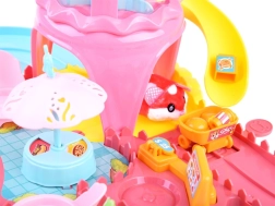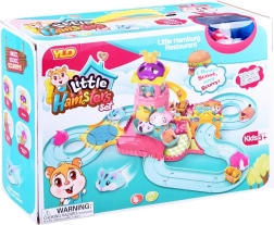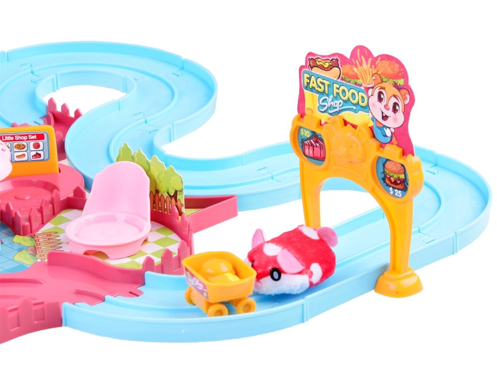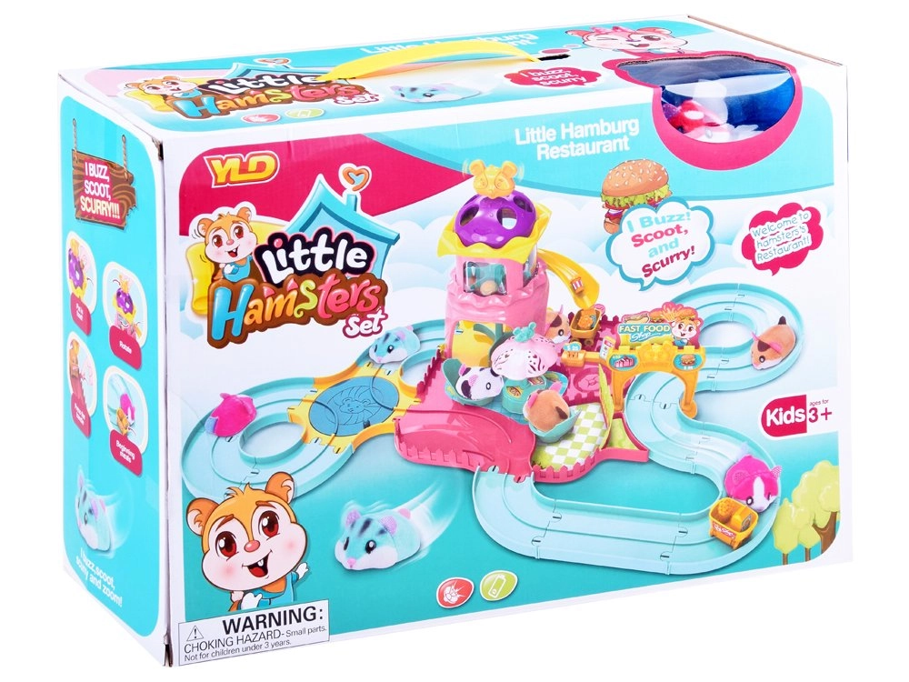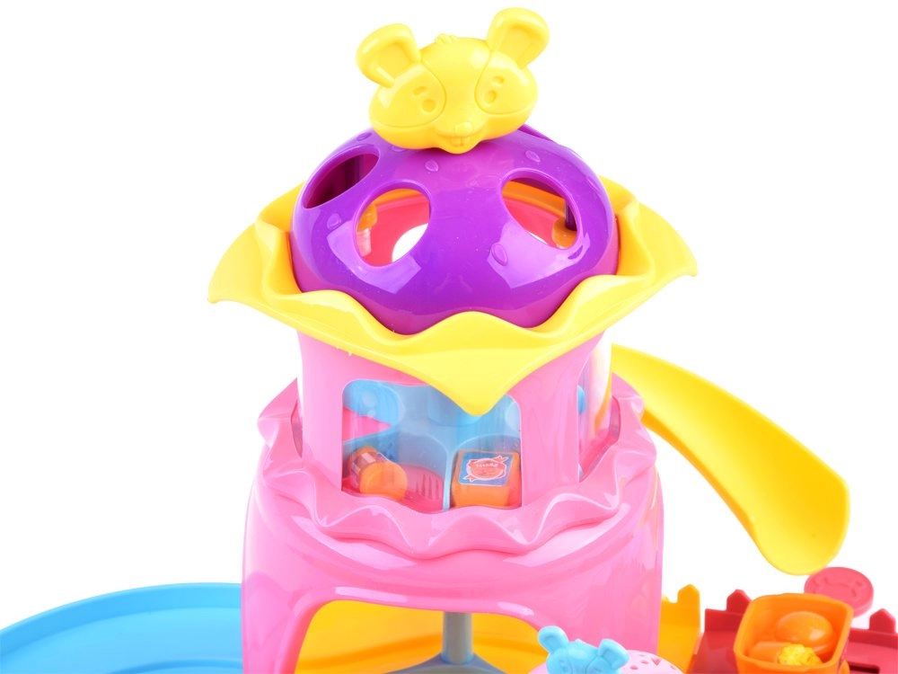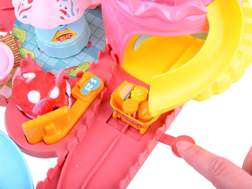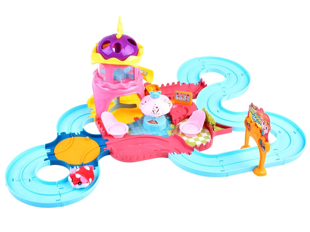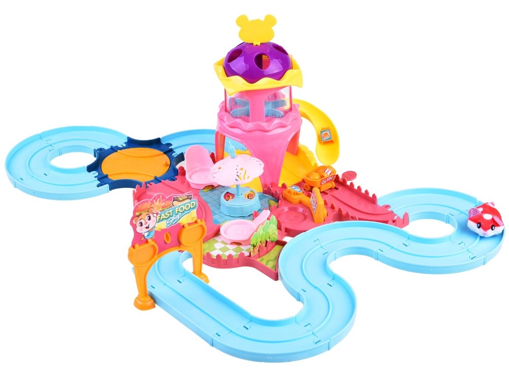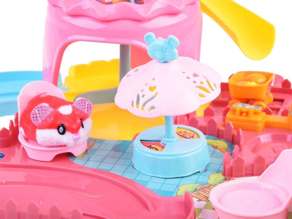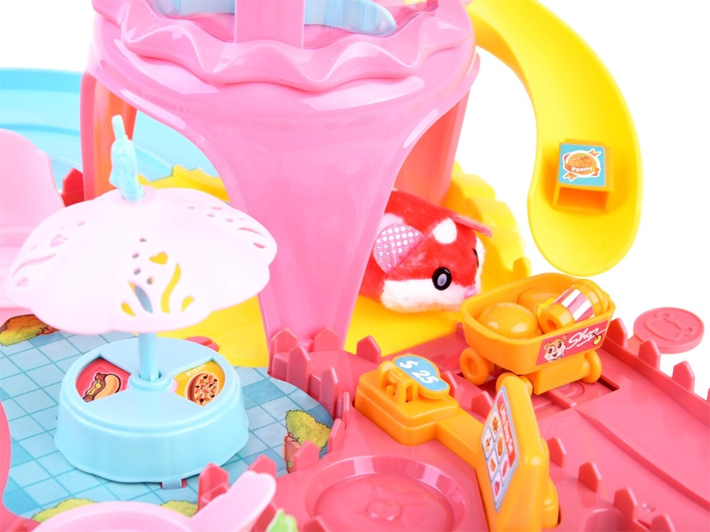 Este completo set de juego transforma la habitación infantil en un colorido parque de atracciones. La pista con torre, tobogán y menú giratorio en el puesto de comida rápida invita al juego creativo y desarrolla la motricidad fina y la imaginación. El hámster interactivo, al encenderse, se pone en marcha y explora la ruta llena de obstáculos y accesorios temáticos.