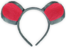 Diadema de peluche gris y roja con orejas de ratón que ofrece un uso cómodo para todas las edades.