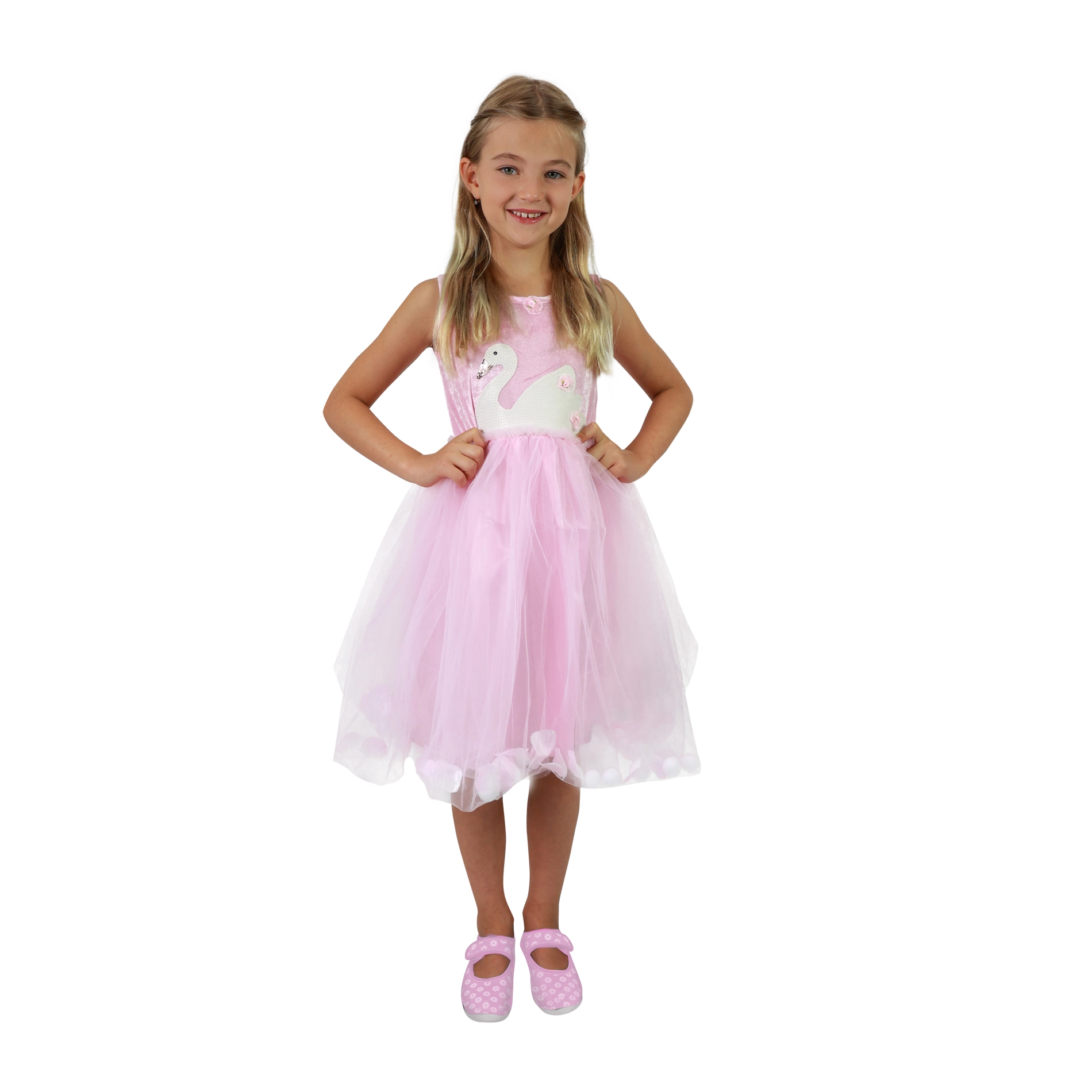 - Diseño: falda rosa con pétalos y bolitas blancas, corpiño con motivo de cisne
