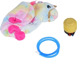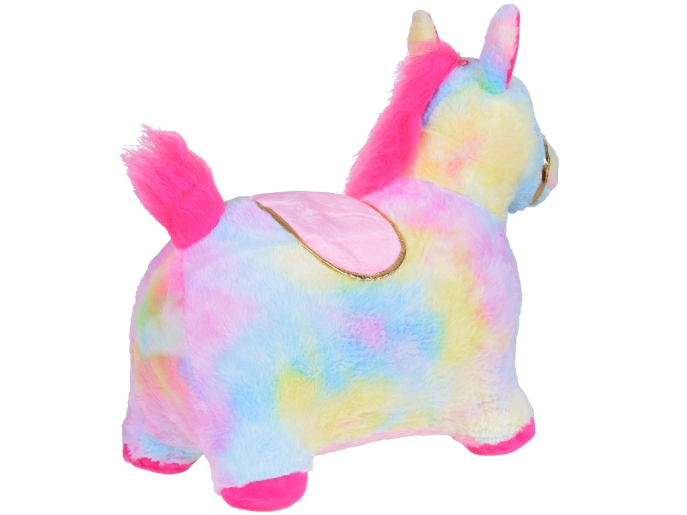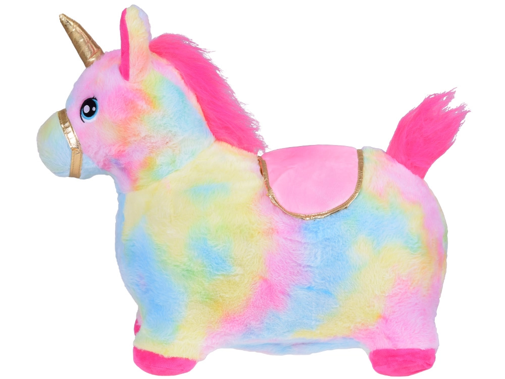 Este unicornio saltarín combina un cuerpo inflable de goma resistente con una funda de felpa suave y agradable en colores arcoíris. Los detalles cuidadosamente elaborados, como ojos bordados, brida dorada, una silla de tela acolchada con ribete dorado y una crin y cola rosas, les encantarán a los niños. Entre las orejas hay un silbato oculto que hace cada salto aún más divertido.
