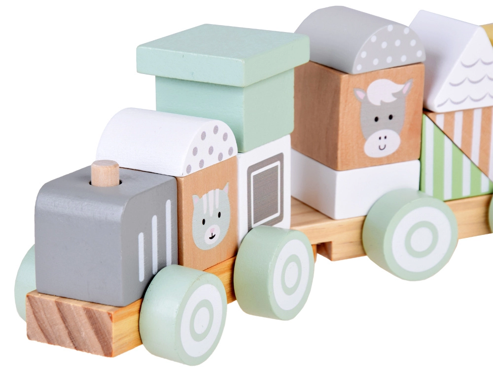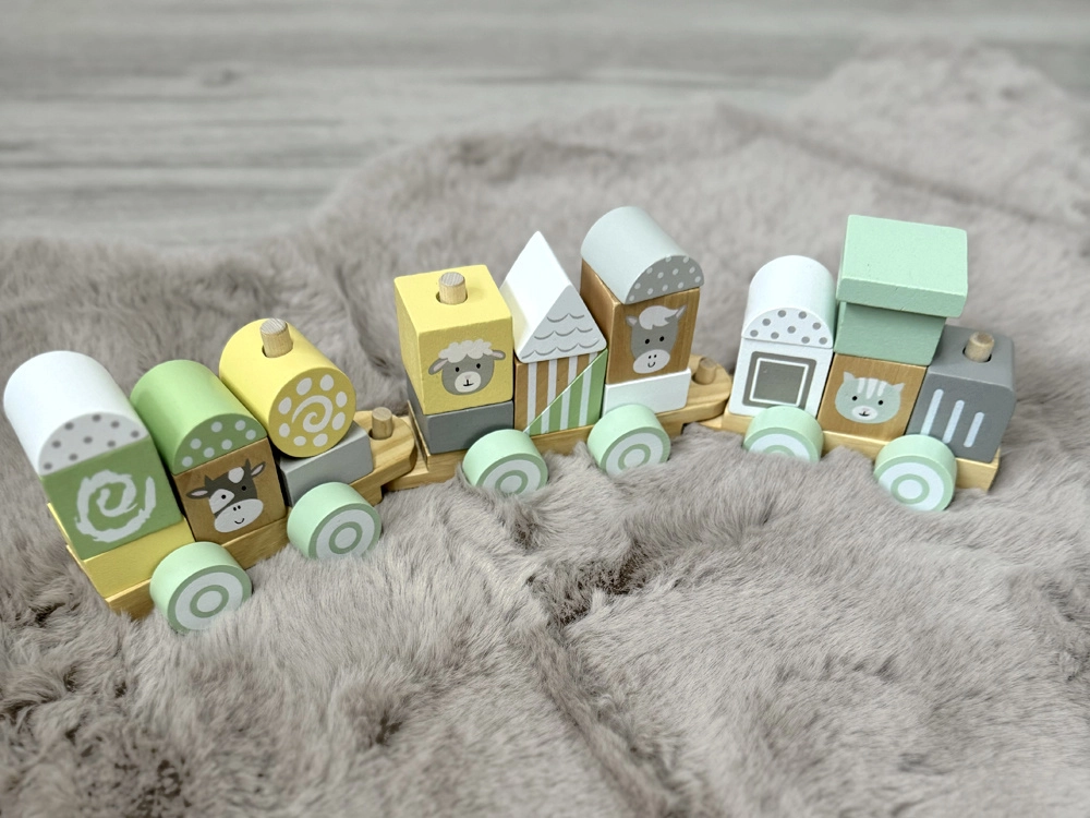 Cada vagón de este tren está sólidamente fabricado en madera resistente y se conecta fácilmente con los demás, creando un tren largo que los niños pueden desplazar por el suelo. Los colores pastel le aportan un encanto especial y combinan perfectamente con cualquier habitación infantil.