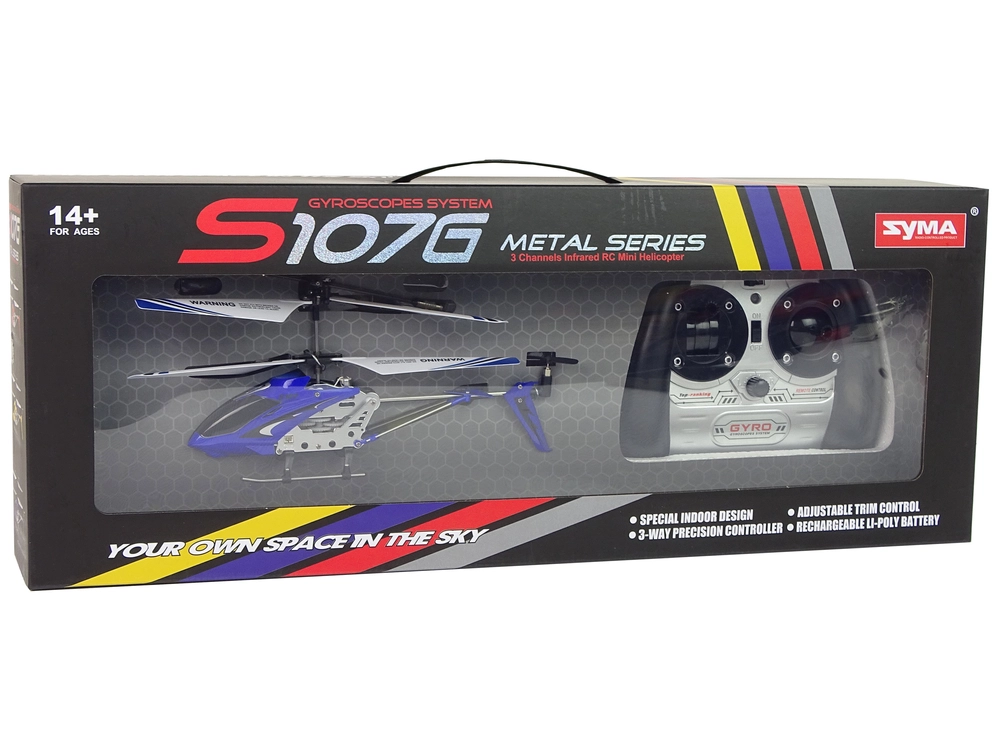 El helicóptero RC SYMA S107G está equipado con un sistema de vuelo de tres canales, que permite movimiento en todas las direcciones, incluso en diagonal. Ideal para principiantes gracias al rotor coaxial contrarrotativo y al rotor trasero vertical, que proporcionan un control sencillo. La estabilidad del vuelo se refuerza además con un giroscopio mejorado, que evita la rotación indeseada alrededor del eje.