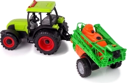 El pulverizador con remolque tiene dos ruedas, se desconecta fácilmente y sus brazos se despliegan para una amplia cobertura, ideal para un juego de granja realista.