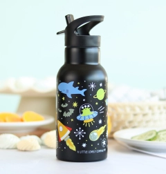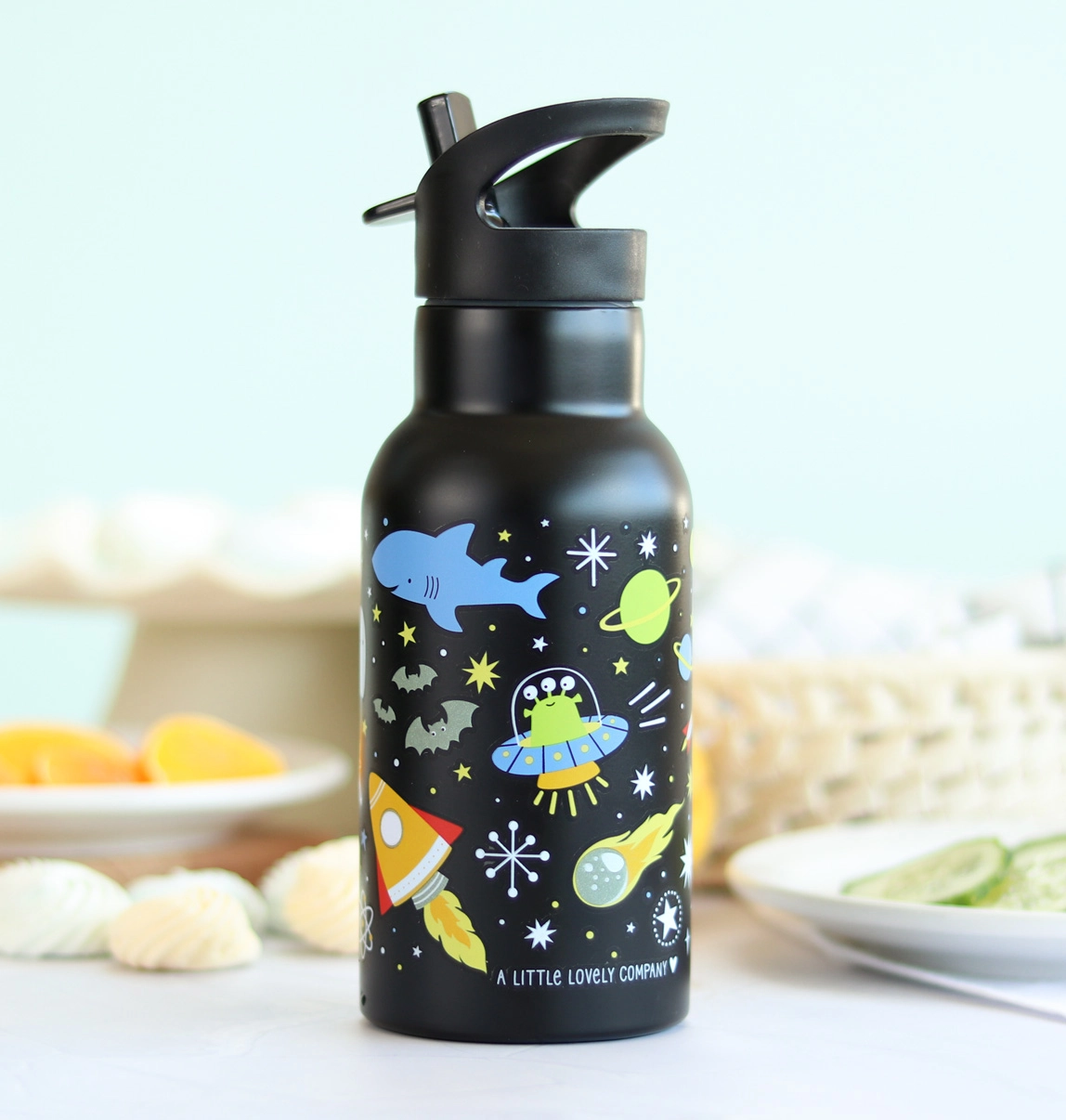 El cuerpo de acero inoxidable resiste el uso diario; el colorido estampado con planetas y cohetes encantará a los niños.