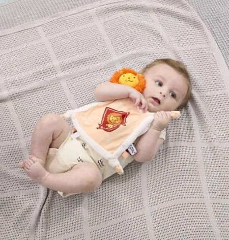 Las esquinas anudadas y las suaves etiquetas fomentan la exploración táctil y la motricidad fina. El bebé se entretiene y entrena el agarre de forma natural.