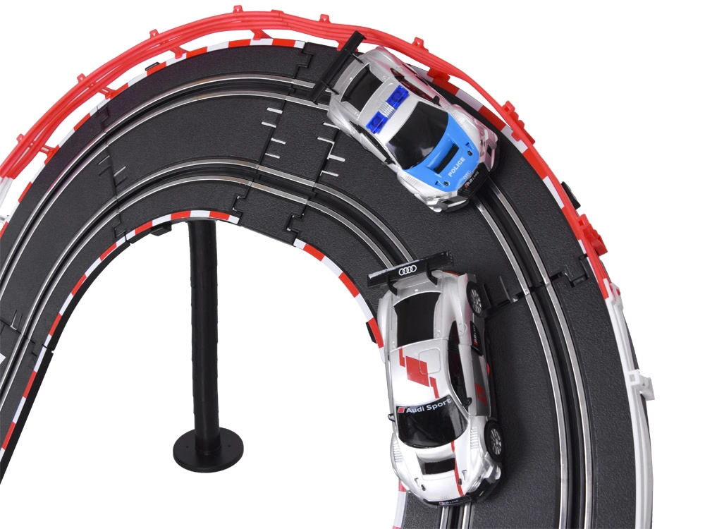 Construye tu propio circuito con puentes, bucles y dinámicos cambios de altura. Gracias a la alimentación por red y a los mandos precisos con función de “acelerador”, tienes la velocidad bajo control en todo momento. Los dos coches de carreras AUDI, detallados, se mantienen en la trazada y superan incluso los elementos más exigentes del circuito.