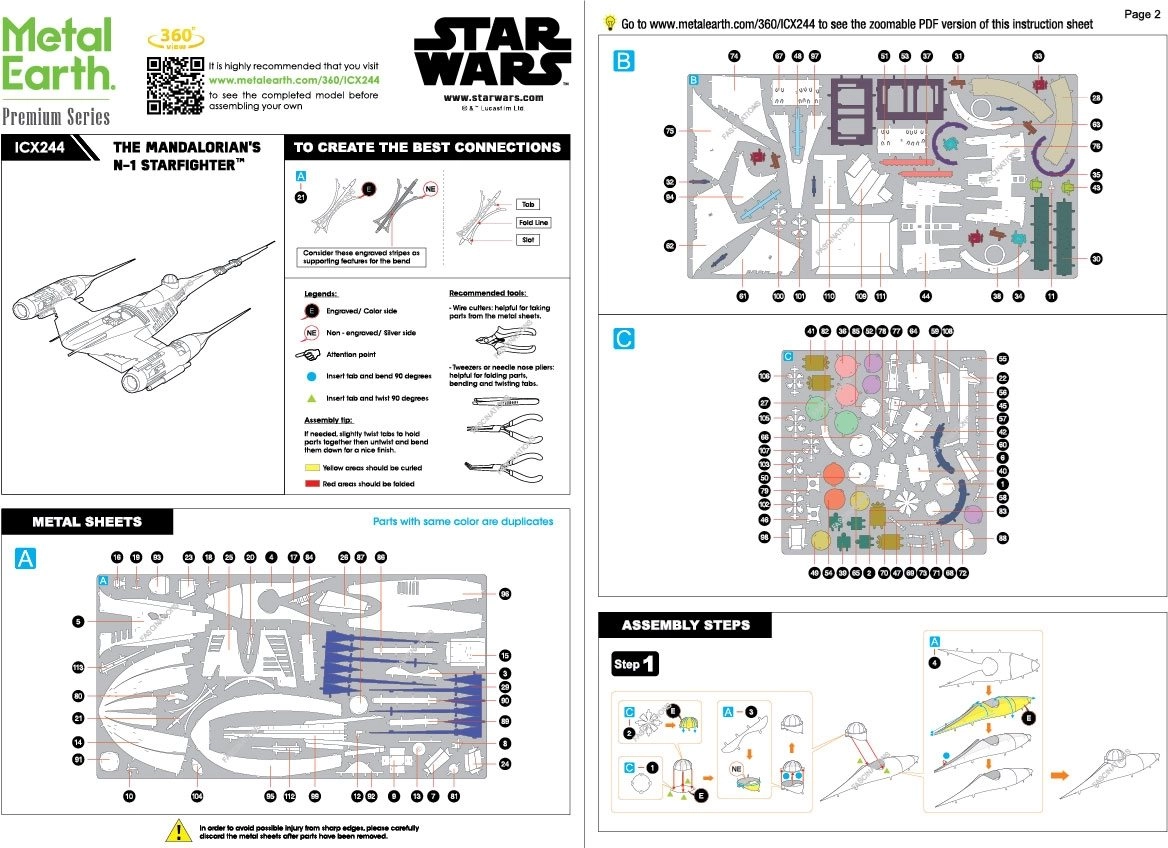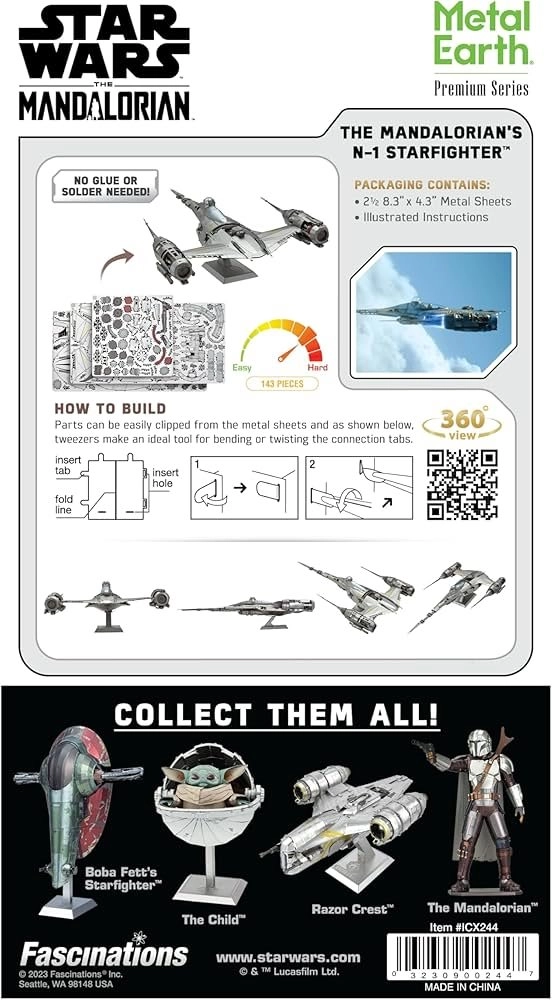 Este set premium permite a fans de THE MANDALORIAN y modelistas construir una réplica precisa del legendario N‑1 Starfighter. A partir de láminas cuadradas de acero darás forma y unirás las piezas en un impresionante modelo metálico con fino grabado láser que reproduce fielmente el aspecto original de la nave.