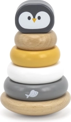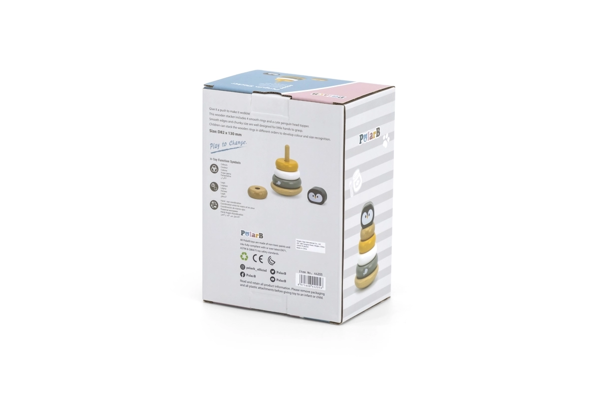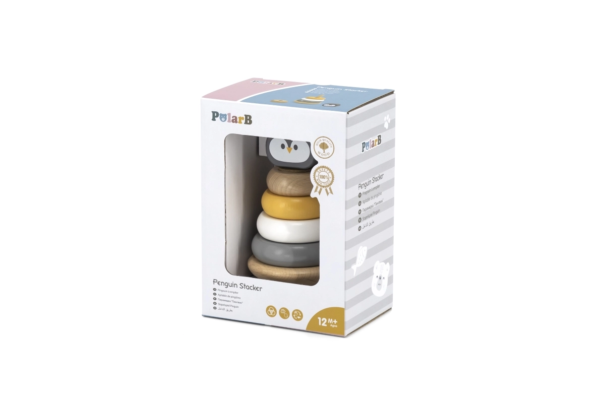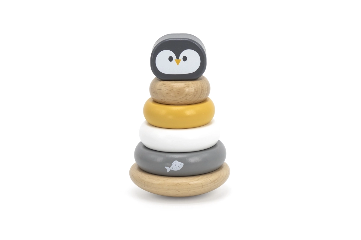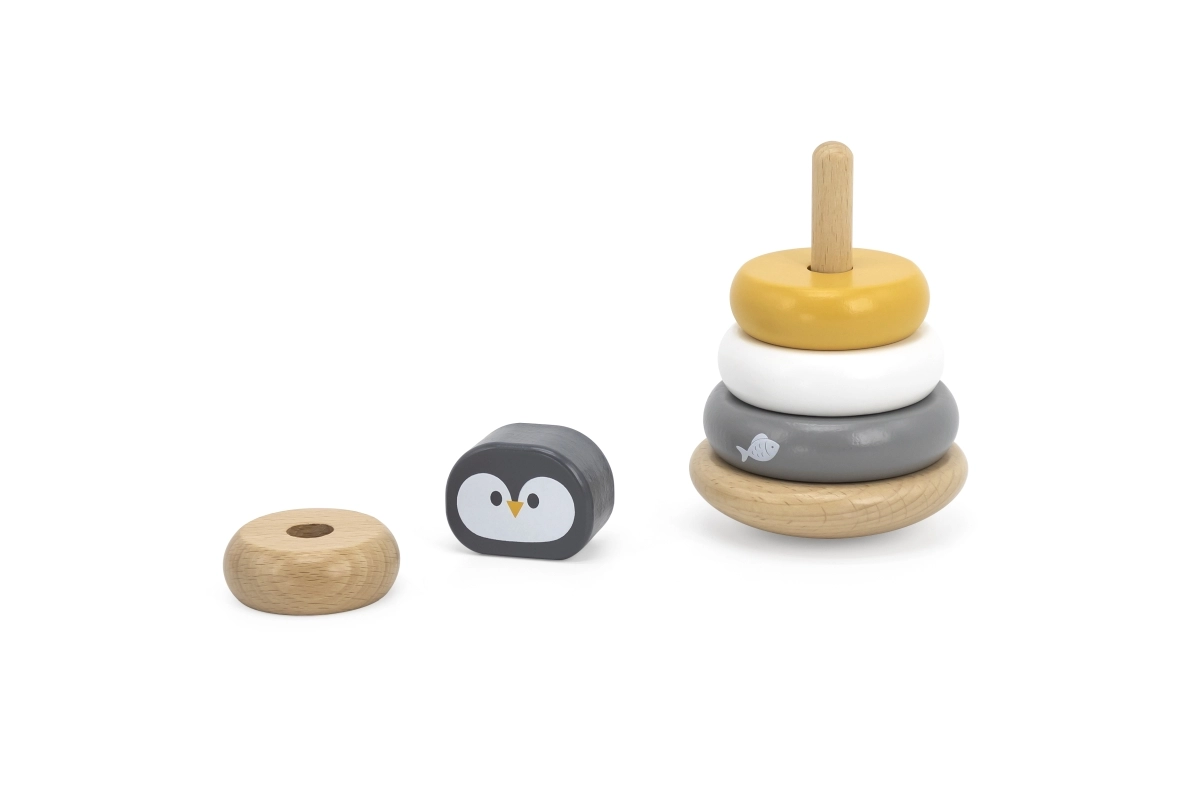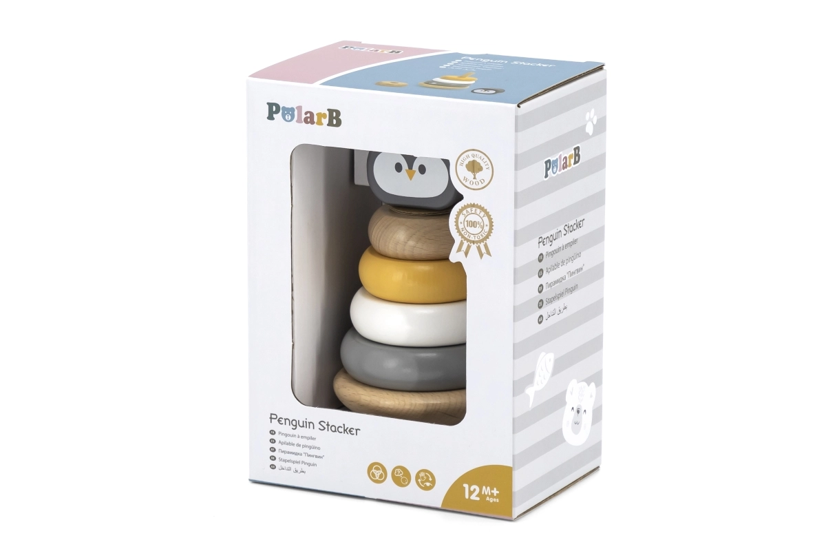 La pirámide apilable de madera pingüinito POLARB es un juguete clásico para los más pequeños que combina juego divertido con el desarrollo temprano de habilidades. Los niños ensartan las piezas en la varilla central, las clasifican por tamaño y color y colocan la cabecita del pingüino en la parte superior. Así ejercitan de forma natural la motricidad fina, la coordinación ojo-mano y el pensamiento lógico.