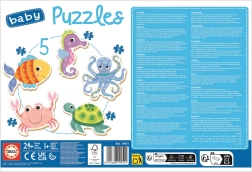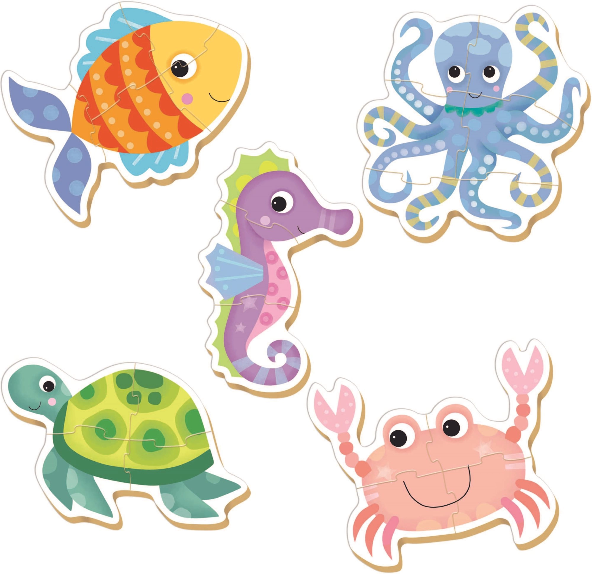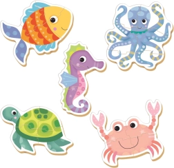 Un pez, un pulpo, un caballito de mar, una tortuga y un cangrejo en colores vivos atraen la atención y motivan a montar los puzzles.