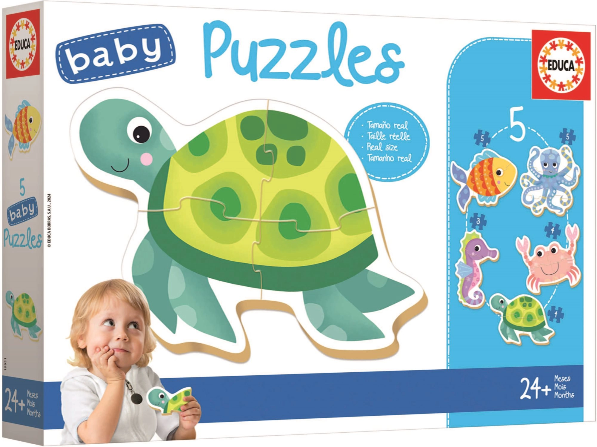 El baby puzzle EDUCA Animales acuáticos 5en1 está diseñado especialmente para los más pequeños. Favorece el desarrollo psicomotor, la coordinación mano-ojo y también la paciencia y el razonamiento lógico. La imagen montada mide aproximadamente 15 × 15 cm, tamaño ideal para manos pequeñas y primeros logros.