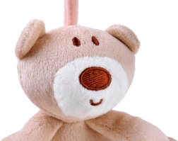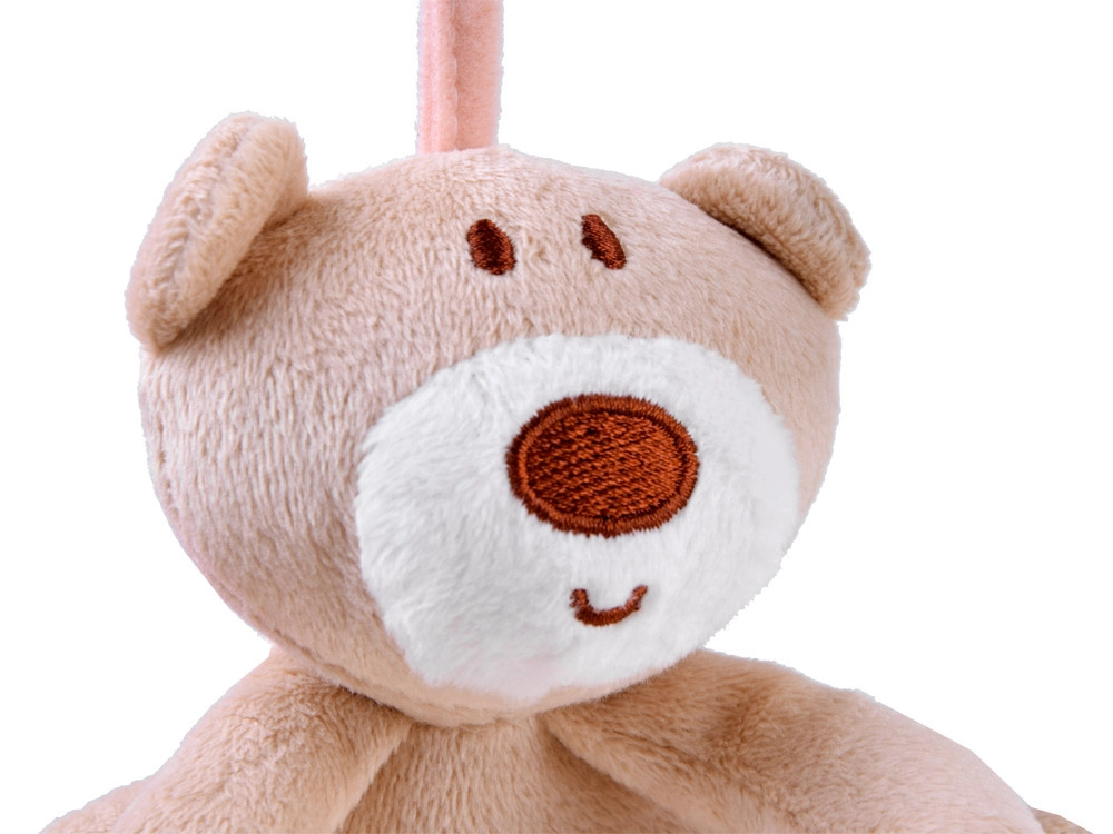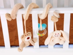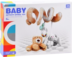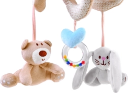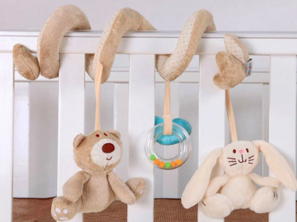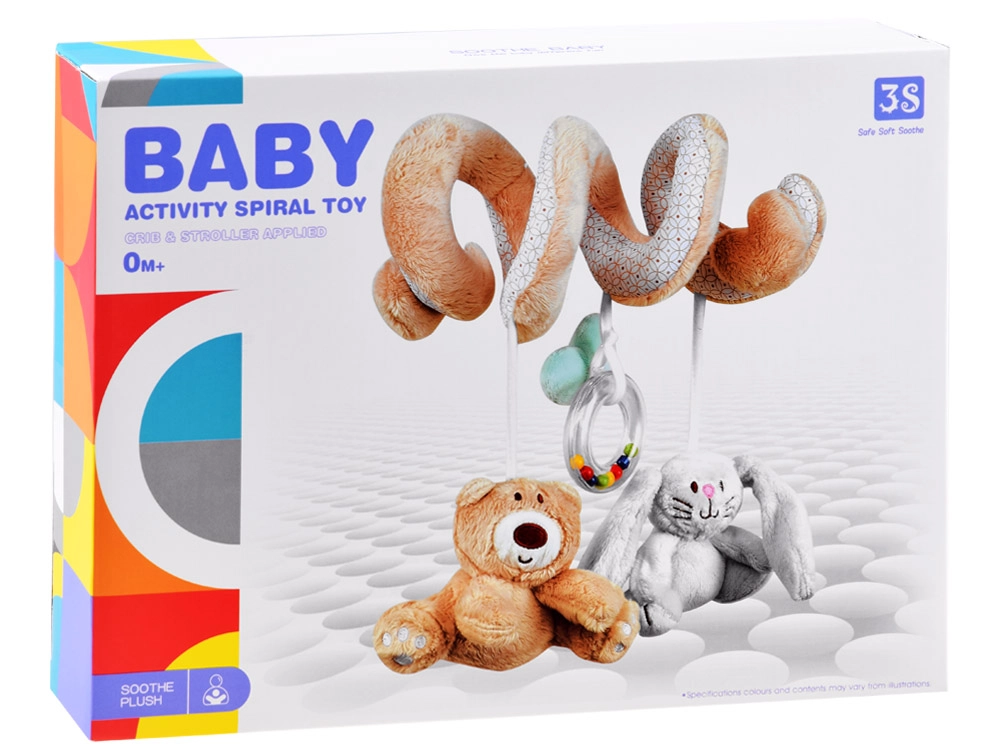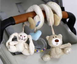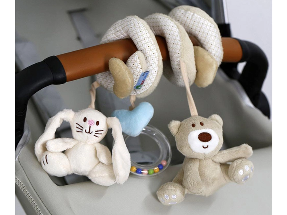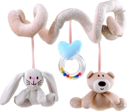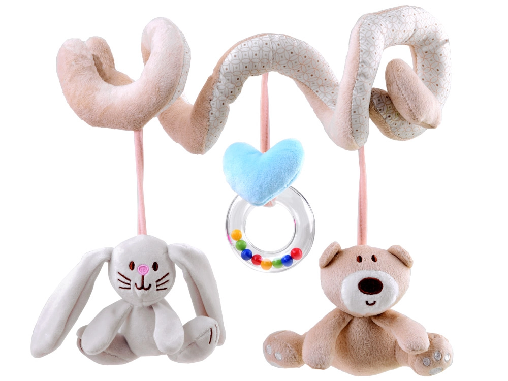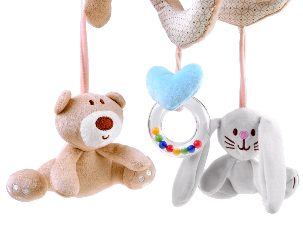 La espiral de peluche incluye tres juguetes colgantes que favorecen el desarrollo sensorial: un osito, un conejito y un aro con cuentas.