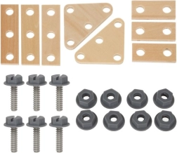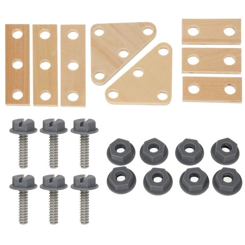 - Carrito–taller; destornillador plano; martillo; llave combinada plana/de estrella; tornillo de banco; placas con orificios × 8; tornillo × 8; tuerca × 8; clavo grande × 2; formas para clasificador (cuadrado, triángulo, círculo); juego de montaje; caja de transporte marrón
