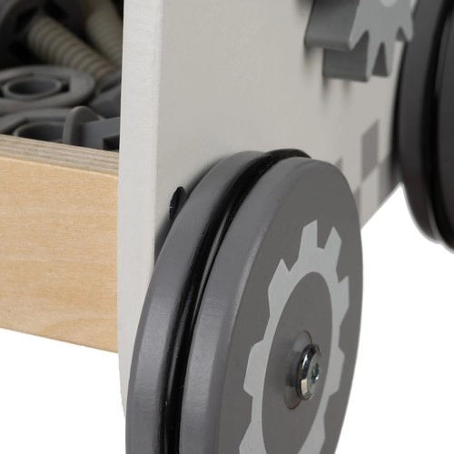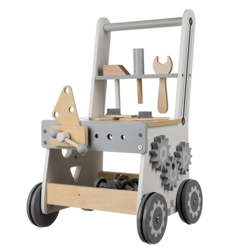 Un producto, tres formas de uso. Los niños pueden atornillar, empujar el carrito en sus primeros pasos y guardar las herramientas y piezas en compartimentos organizados.
