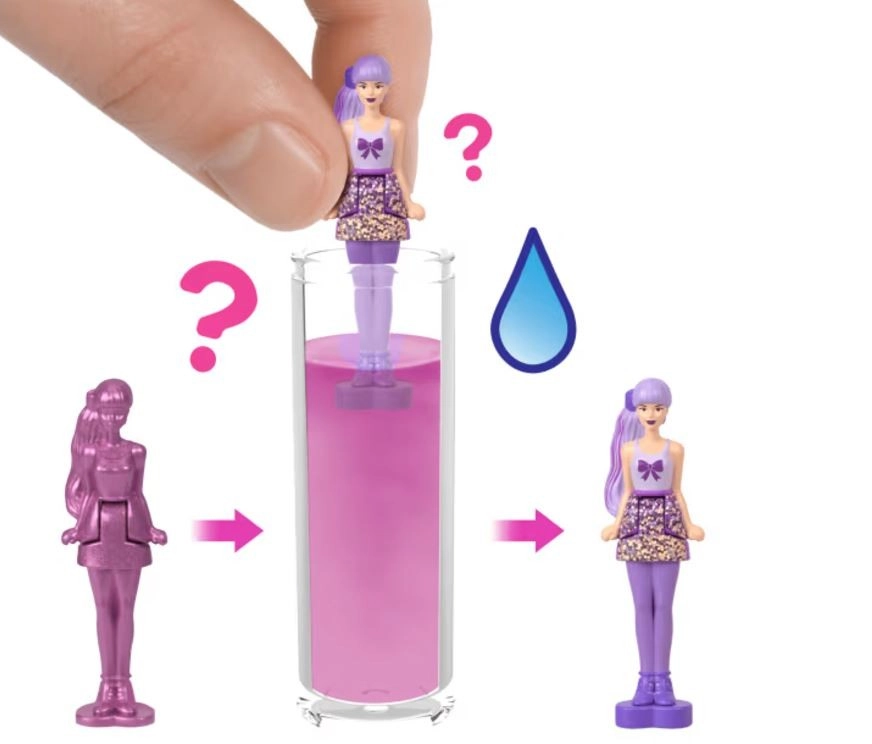 Las mini muñecas Barbie Mini BarbieLand aportan la magia de Barbie en versión mini. Con una muñeca de 3,8 cm de altura, podrás disfrutar de la diversión de revelar colores. Abre el tubo, saca la muñeca cubierta con una capa rosa y, con agua, revela su estilo único y su conjunto, igual que con las Barbie grandes.
