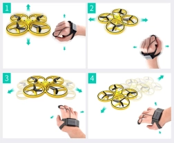 Disfruta de un vuelo intuitivo: coloca la correa de silicona en la muñeca, empareja y marca la dirección con suaves movimientos: adelante/atrás, izquierda/derecha y arriba/abajo. Tras el despegue, el dron se mantiene estable a unos 1,2 m de altura, puede girar 360° y, gracias a las hélices contrarrotativas, vuela de forma suave y segura.