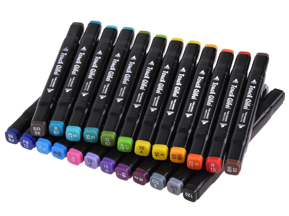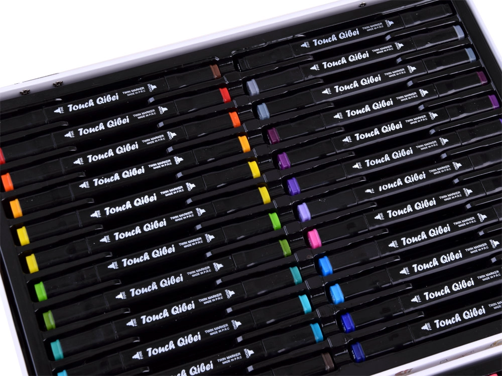 - Todo en uno: 24 rotuladores gruesos, 12 marcadores finos, 8 lápices de colores, 12 acuarelas, 2 pinceles y 1 libro para colorear.