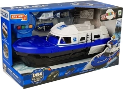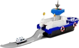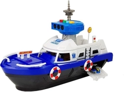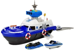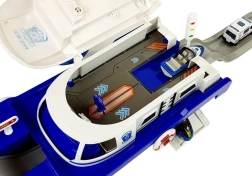 Este robusto barco policial con ruedas ofrece numerosos elementos interactivos: cubierta superior abatible, rampa trasera para vehículos y compartimento bajo cubierta. La torre de control emite señales policiales con luz y sonido (pilas AG13 incluidas). Gracias a sus detalles realistas con aros salvavidas e inscripciones, el juego es realista y cautivador.