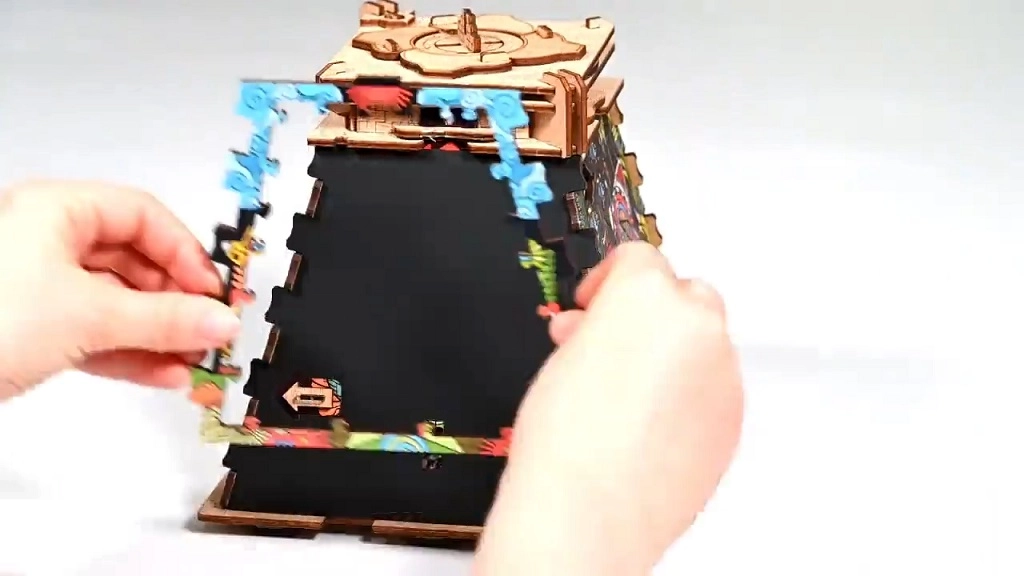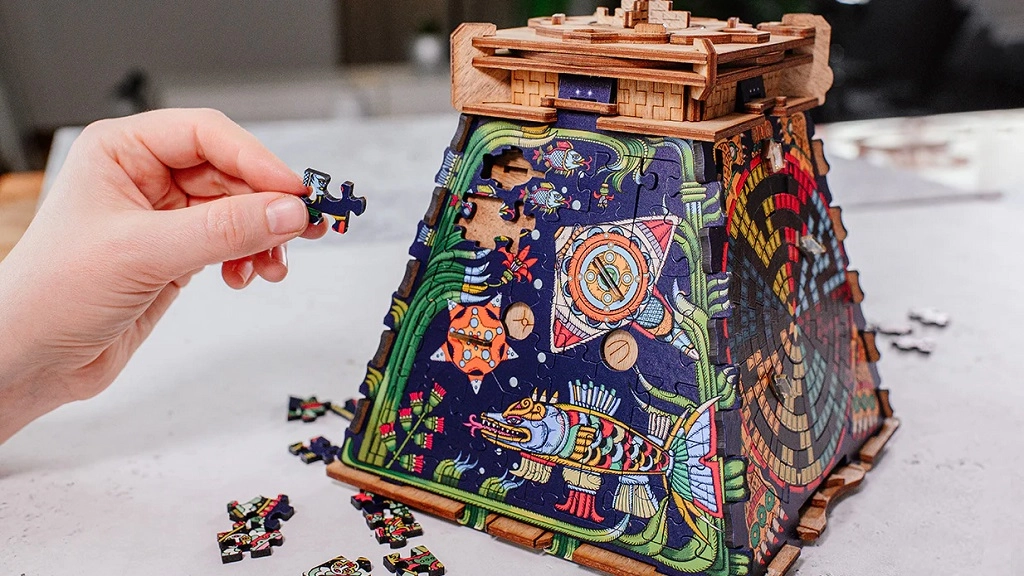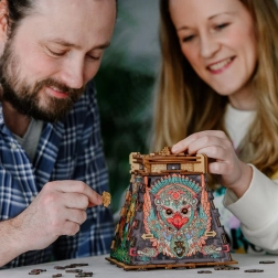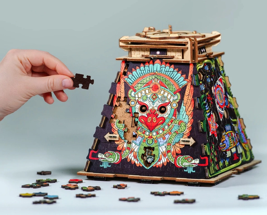 Déjate llevar por el misterio de la pirámide azteca. Con más de 200 piezas, este rompecabezas de madera invita a descubrir pistas ocultas y a resolver tareas lógicas. La apertura de cerraduras mecánicas revela un espacio oculto donde puedes colocar un mensaje personal u otro pequeño detalle. Gracias a las ilustraciones de Steve Simpson y Joaquín Nava, el puzzle no solo es un desafío, sino también una obra de arte.