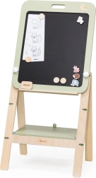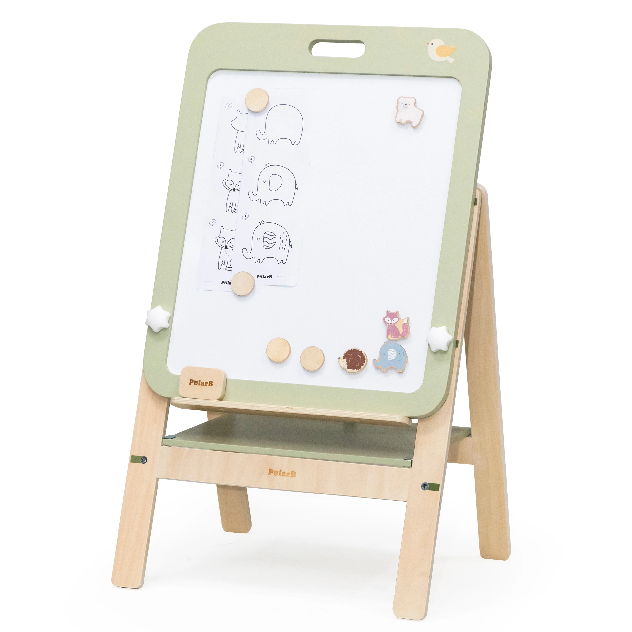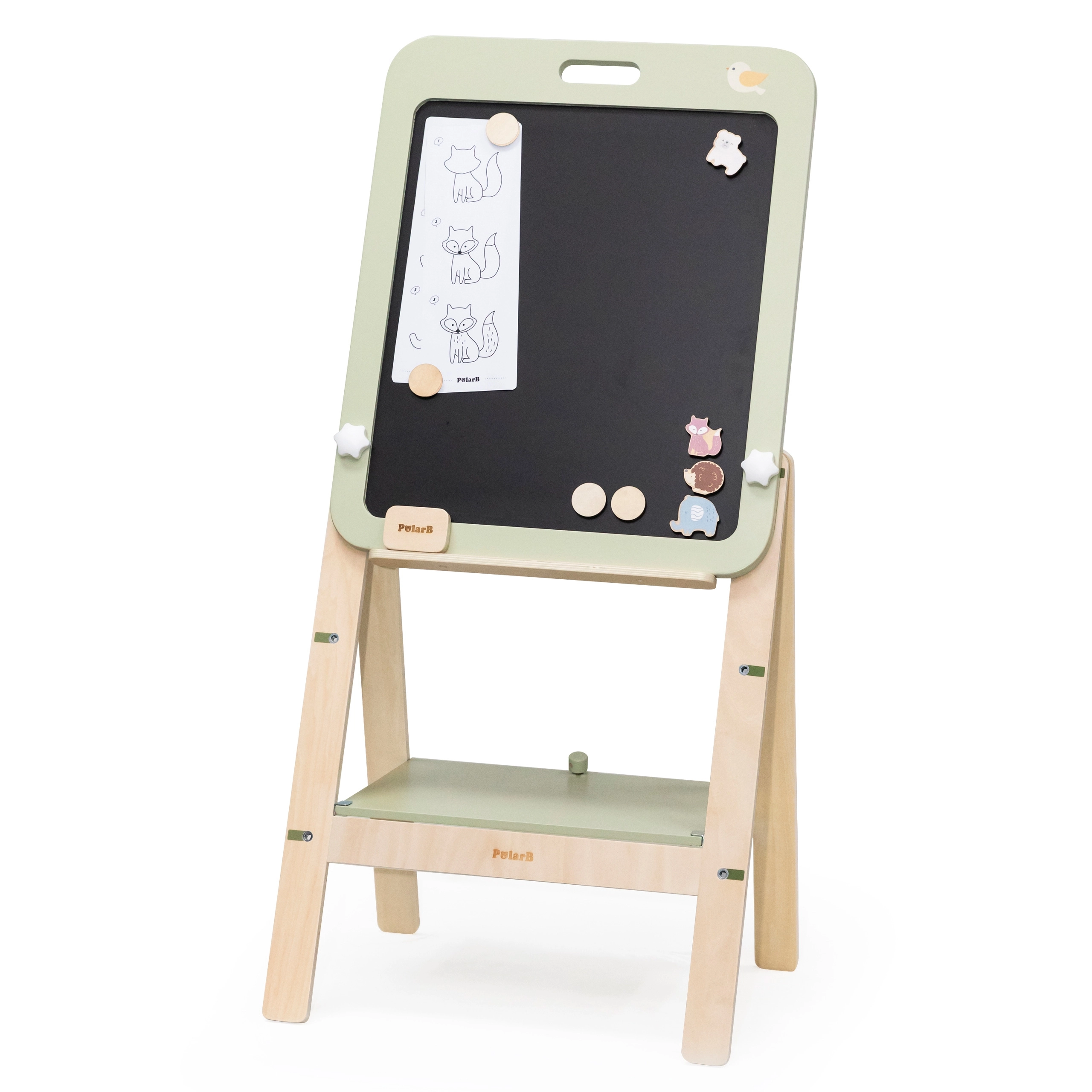 La pizarra de madera ajustable PolarB ofrece una experiencia divertida y educativa para los niños. La pizarra es de doble cara, con una superficie negra para tizas y una superficie blanca magnética para borrado en seco. Gracias a tres niveles de ajuste de altura, es ideal para niños en crecimiento. Al terminar el juego, la pizarra puede desmontarse fácilmente y usarse como decoración colgándola en la pared.