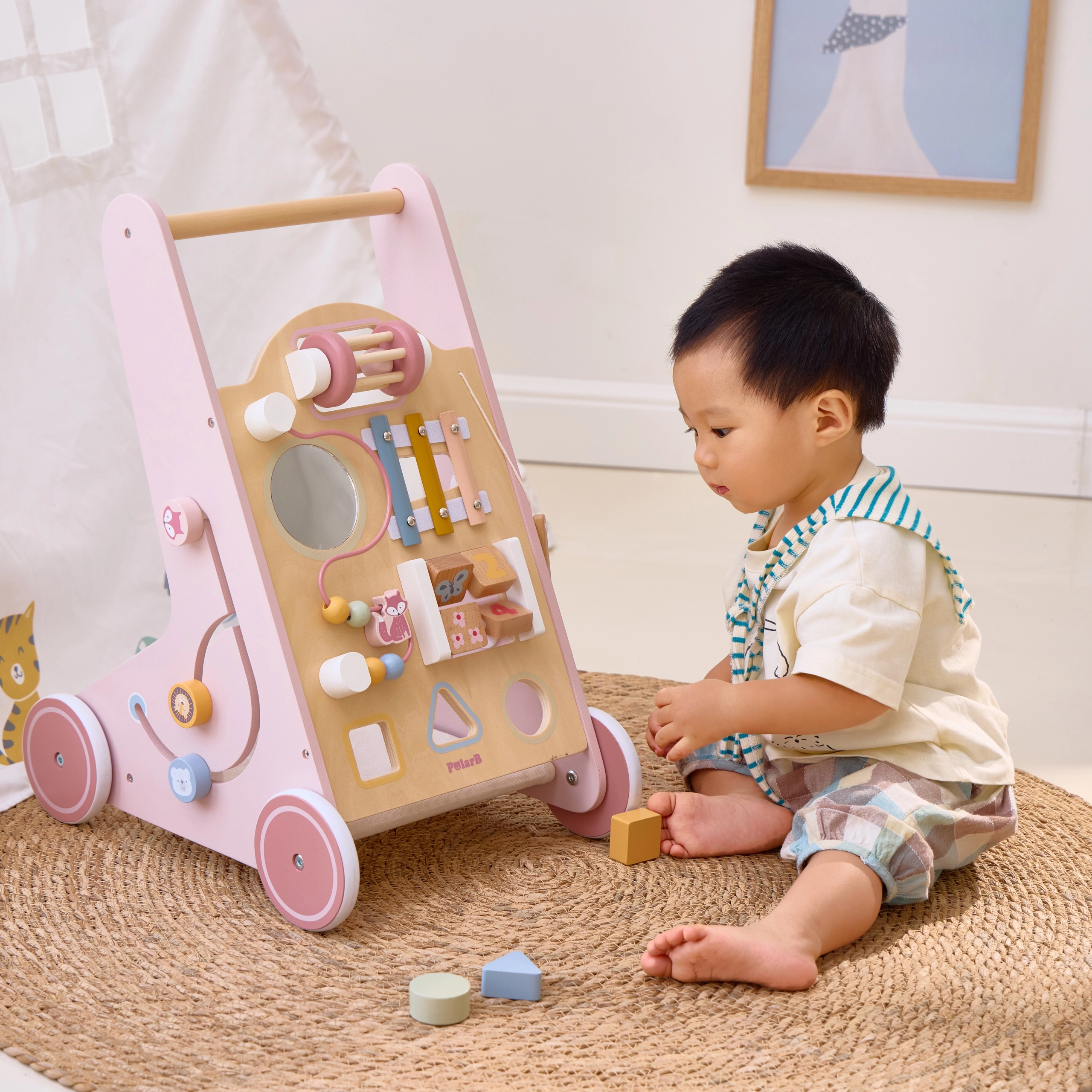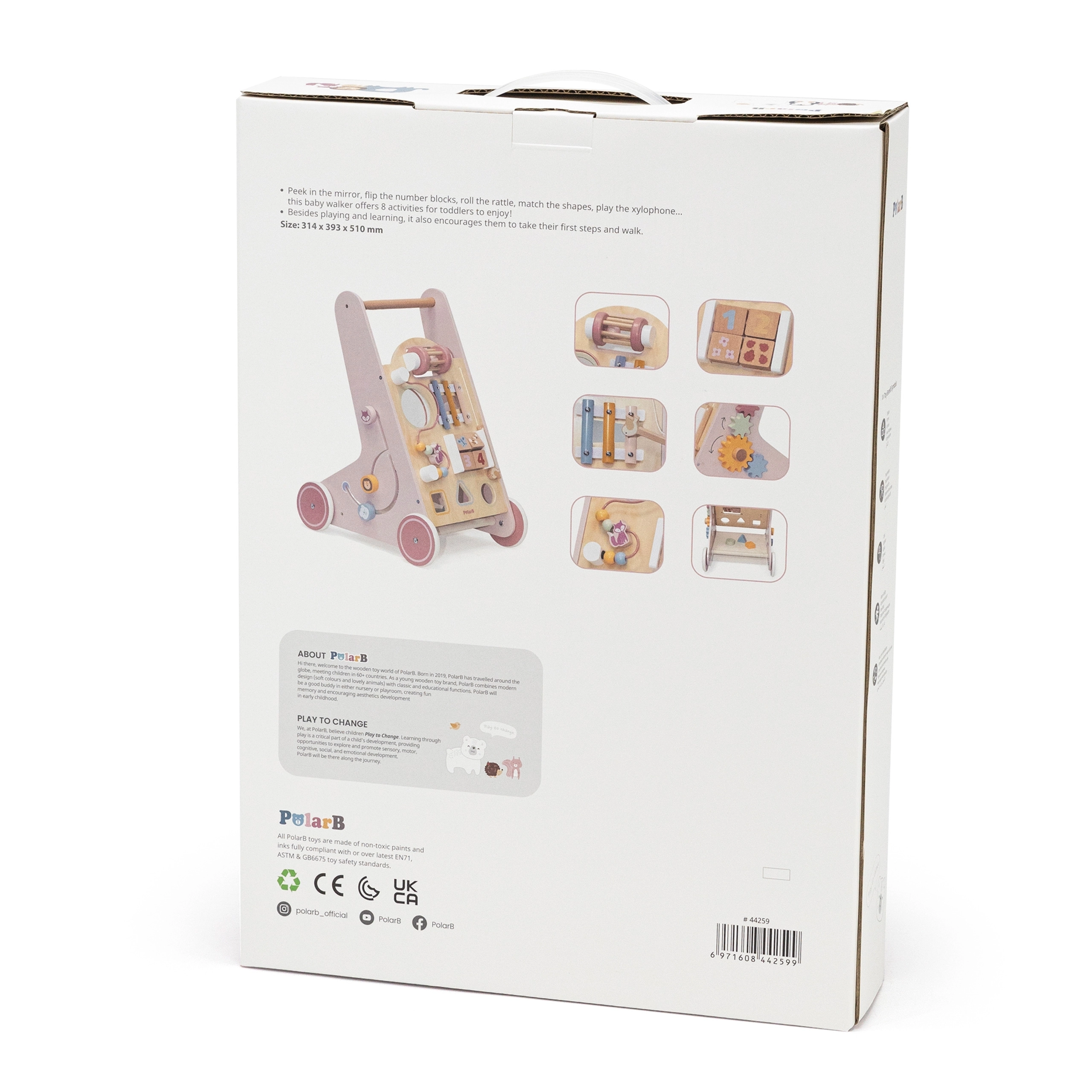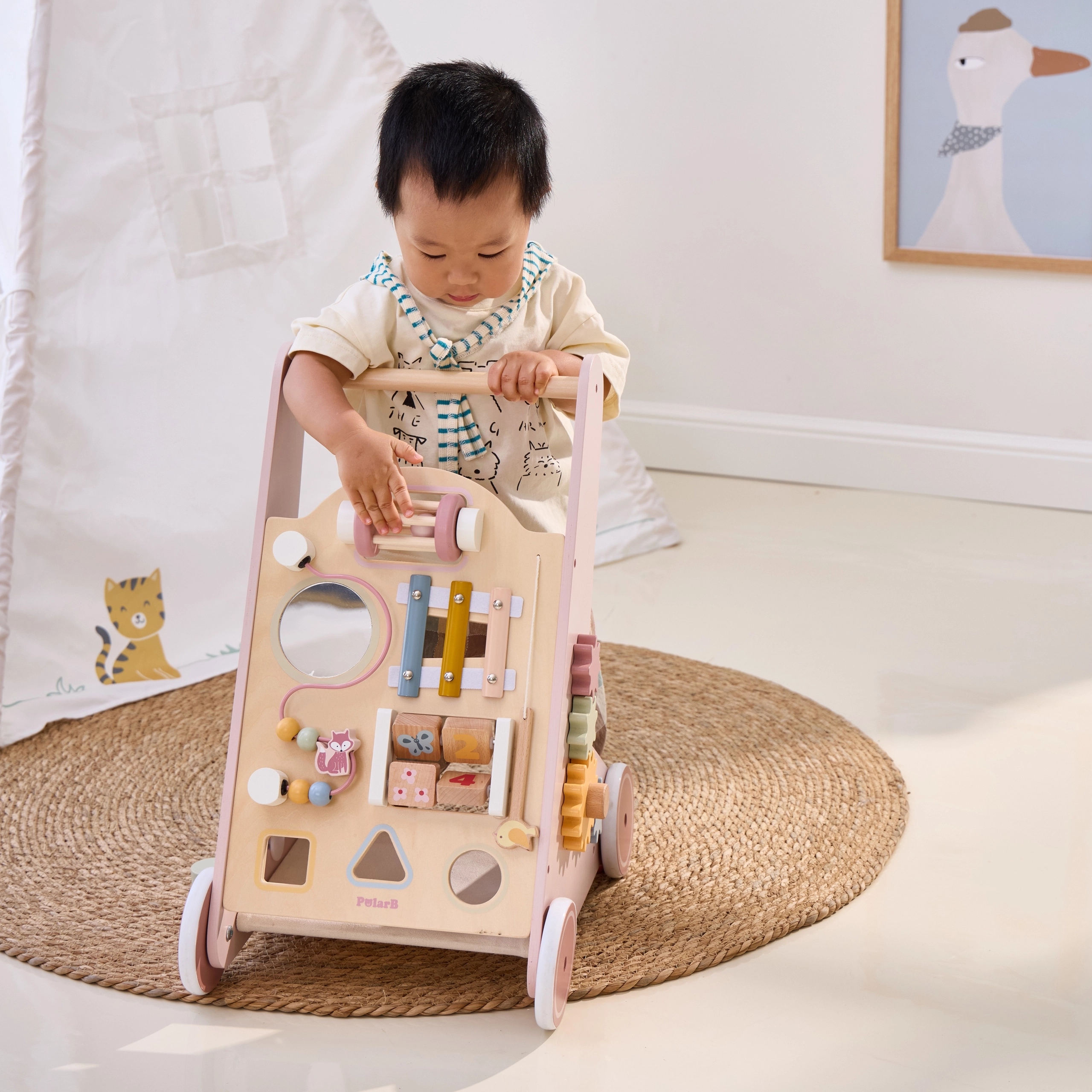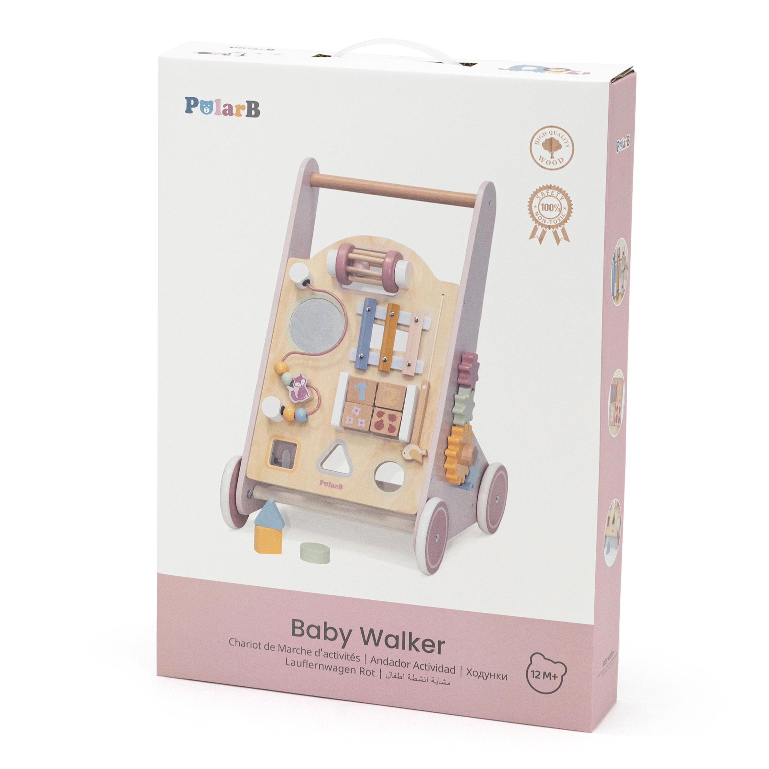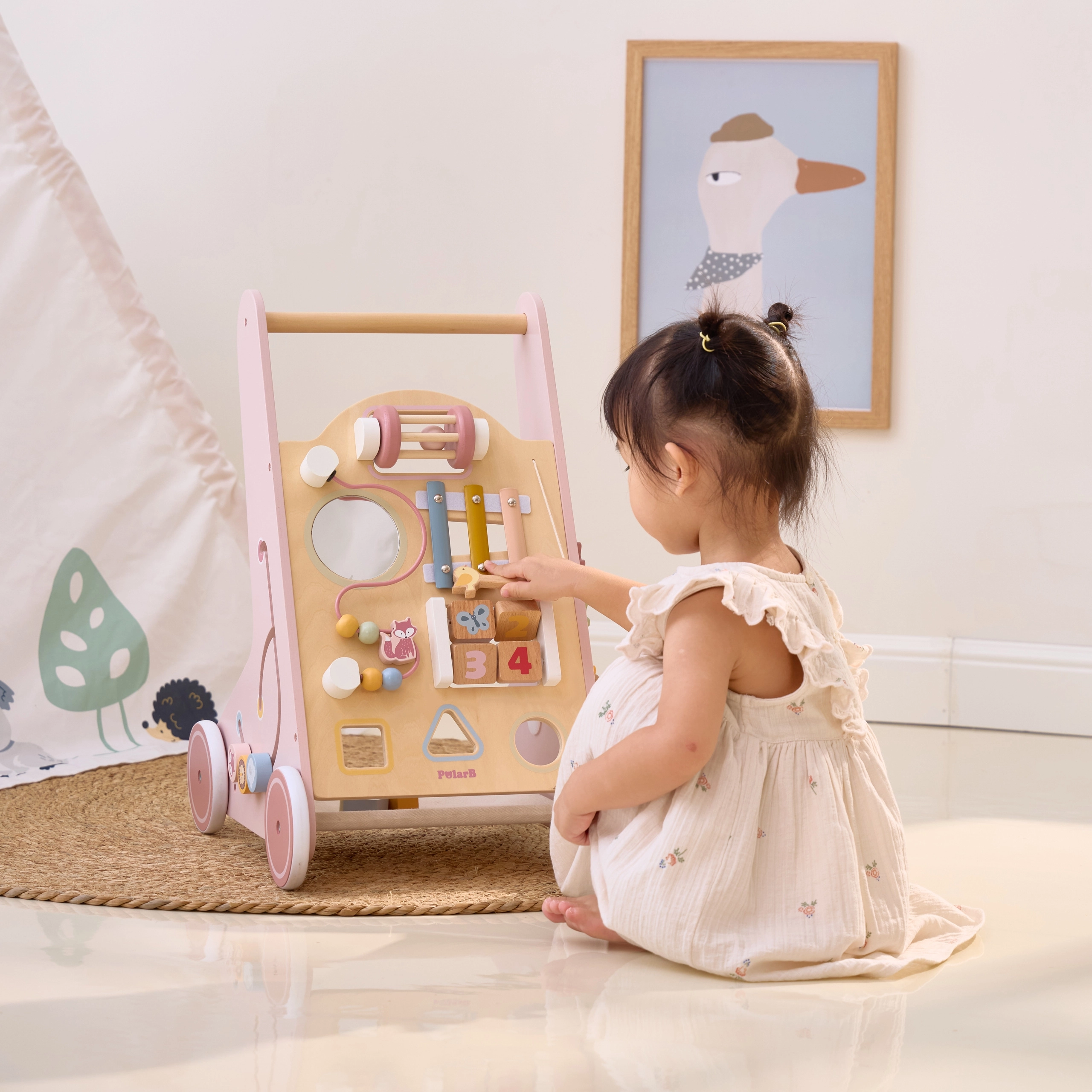 Te presentamos el andador de madera para bebés PolarB en color rosa, diseñado para niños a partir de 18 meses. Combina actividades divertidas como mirarse en el espejo, cubos giratorios, cuentas brillantes, clasificación de formas y tocar el xilófono. Con este andador, tus hijos explorarán el mundo que les rodea con seguridad.