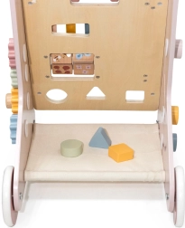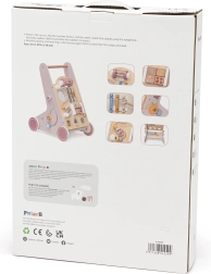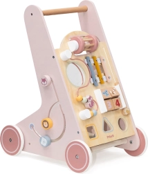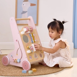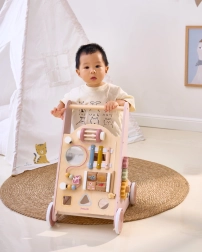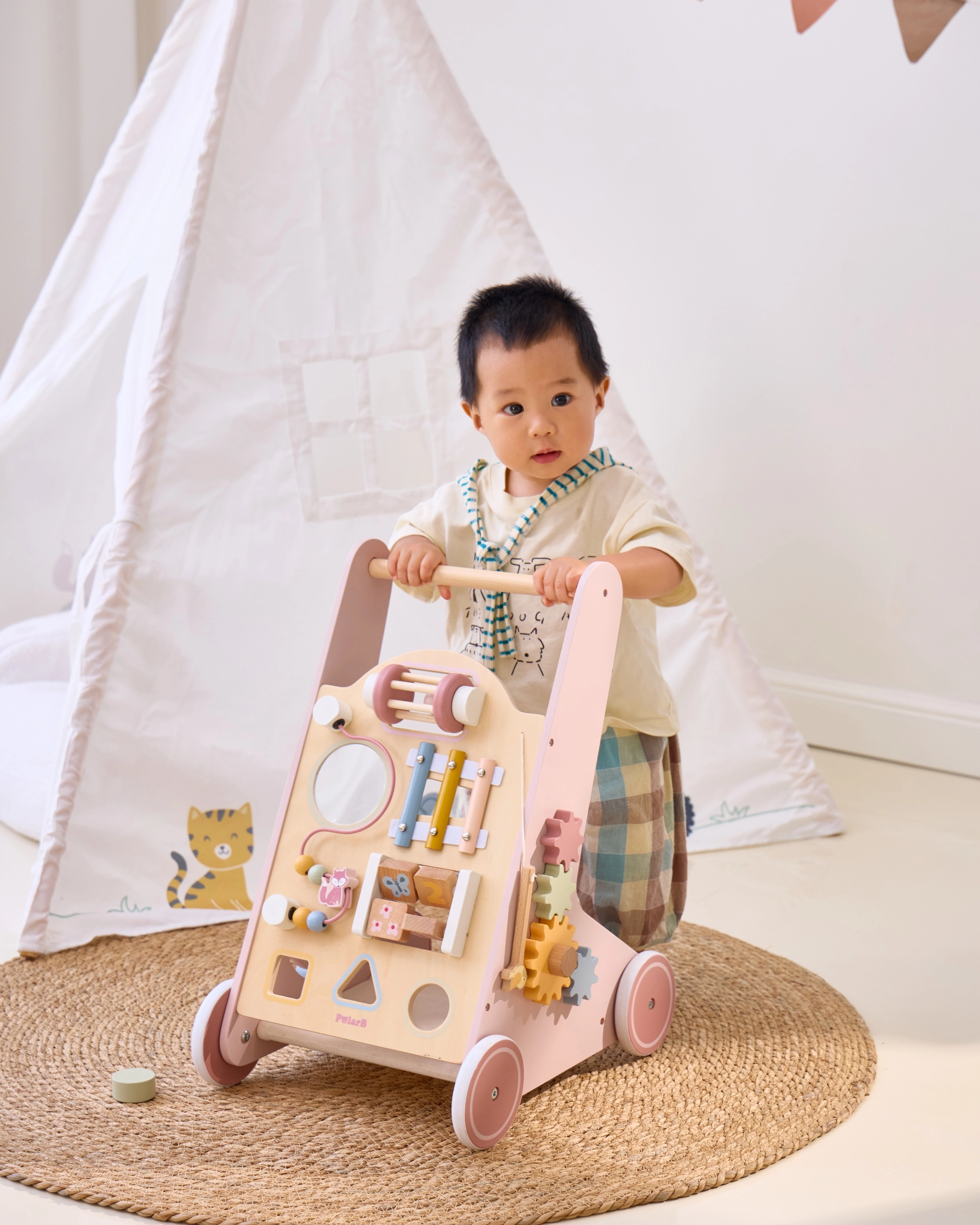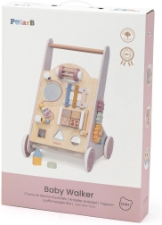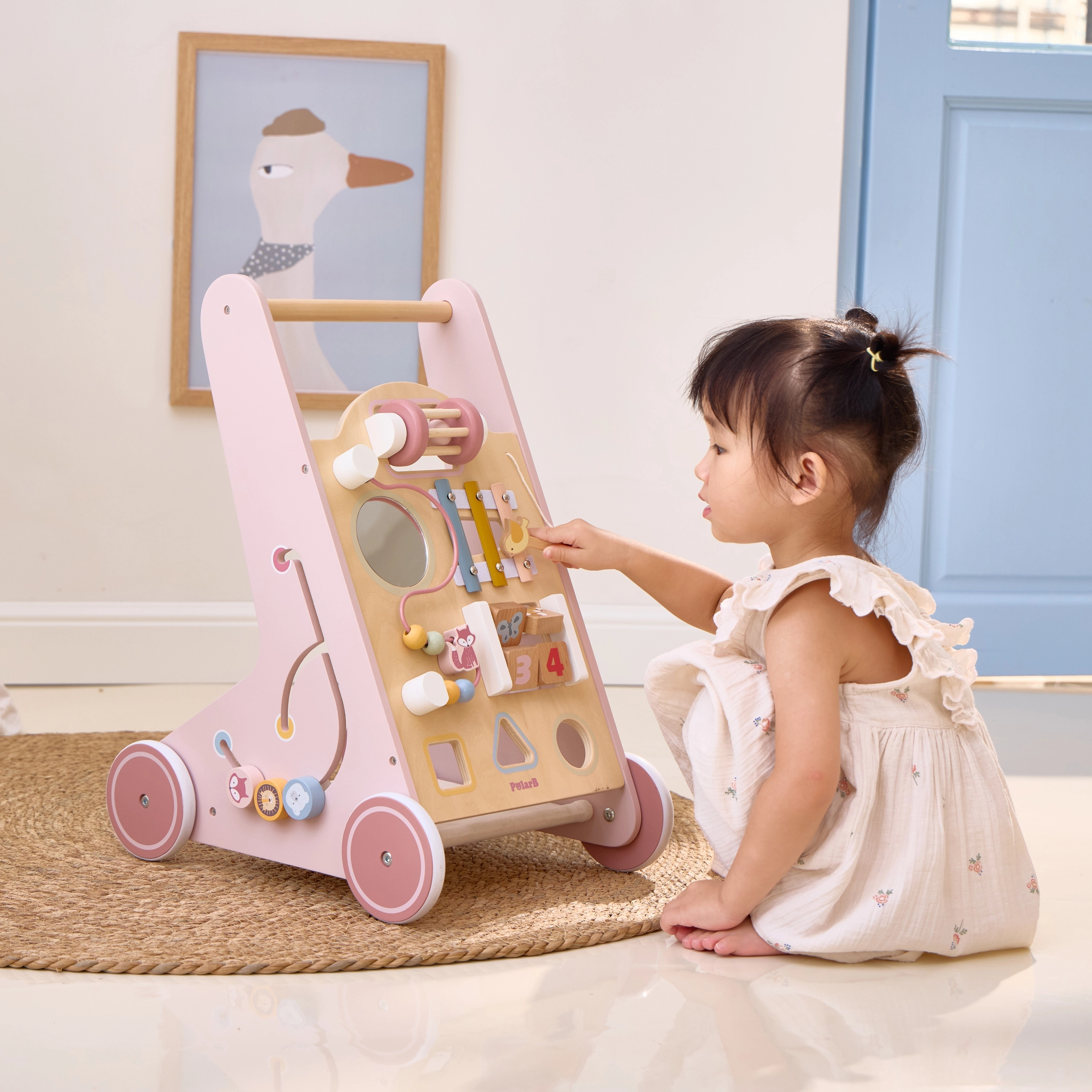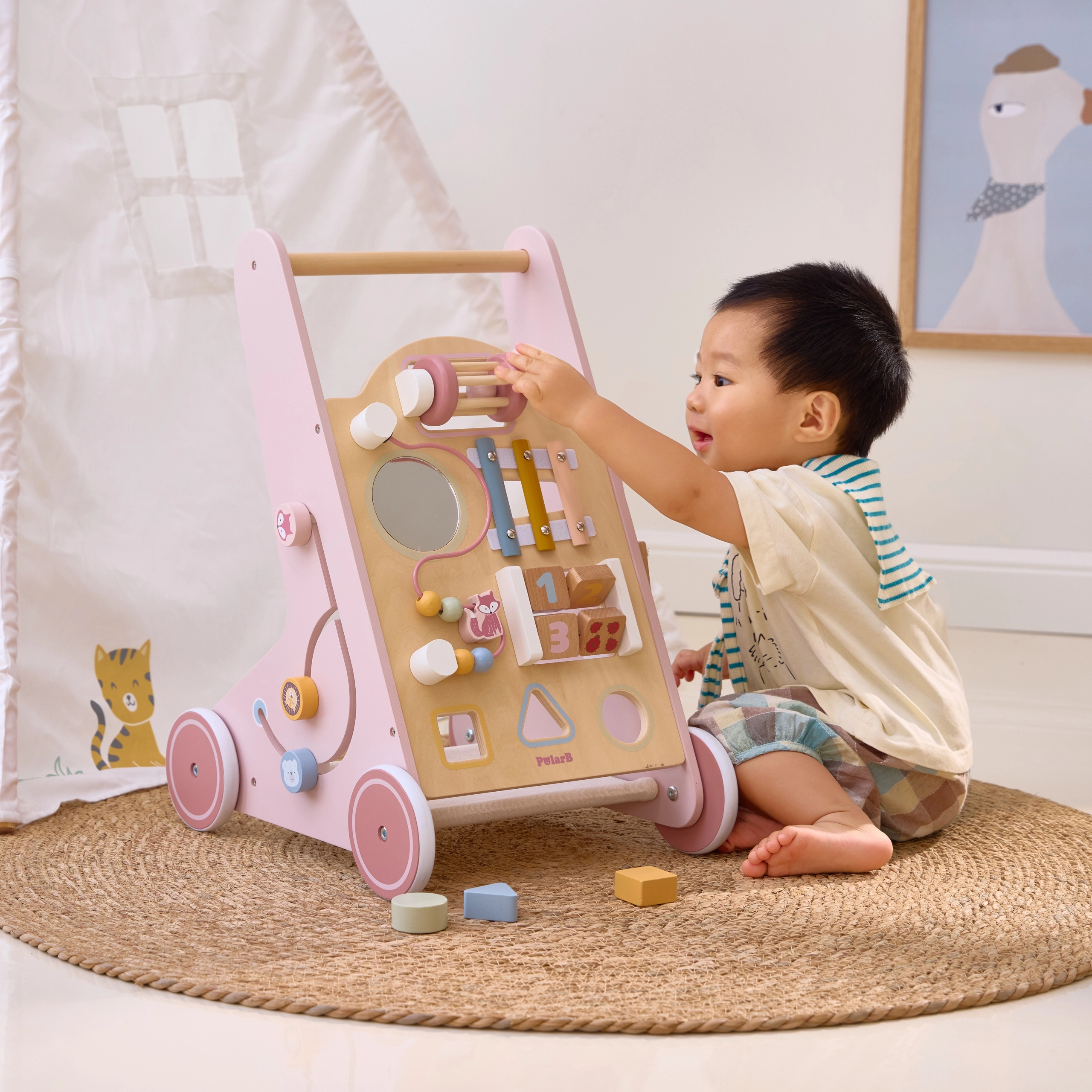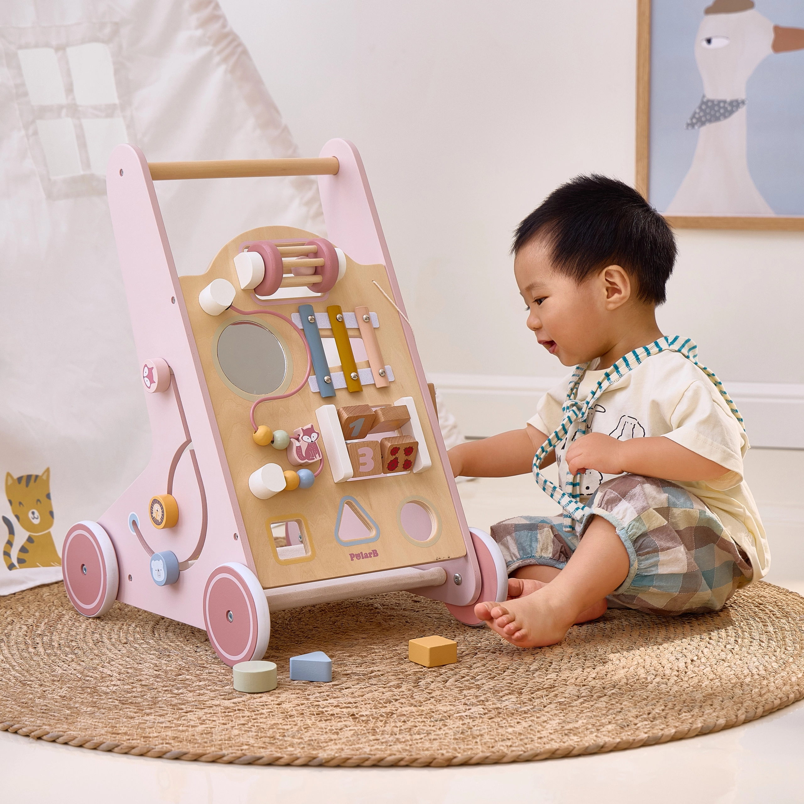 Te presentamos el andador de madera para bebés PolarB en color rosa, diseñado para niños a partir de 18 meses. Combina actividades divertidas como mirarse en el espejo, cubos giratorios, cuentas brillantes, clasificación de formas y tocar el xilófono. Con este andador, tus hijos explorarán el mundo que les rodea con seguridad.