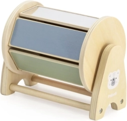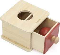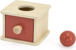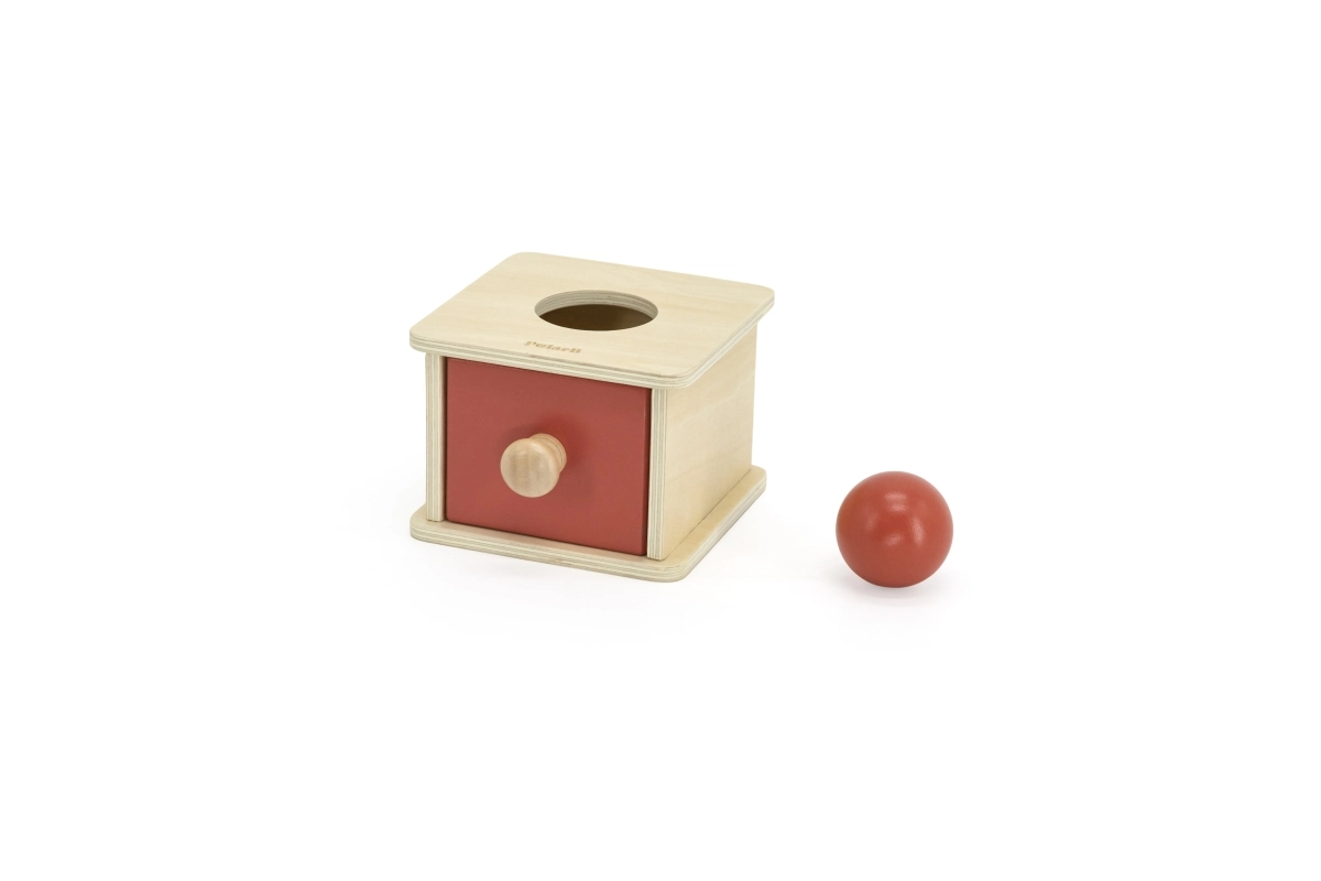 La caja de madera con cajón y pelota enseña al niño que los objetos existen aunque no se vean. Favorece la concentración, la paciencia y las primeras relaciones lógicas al encajar y descubrir.