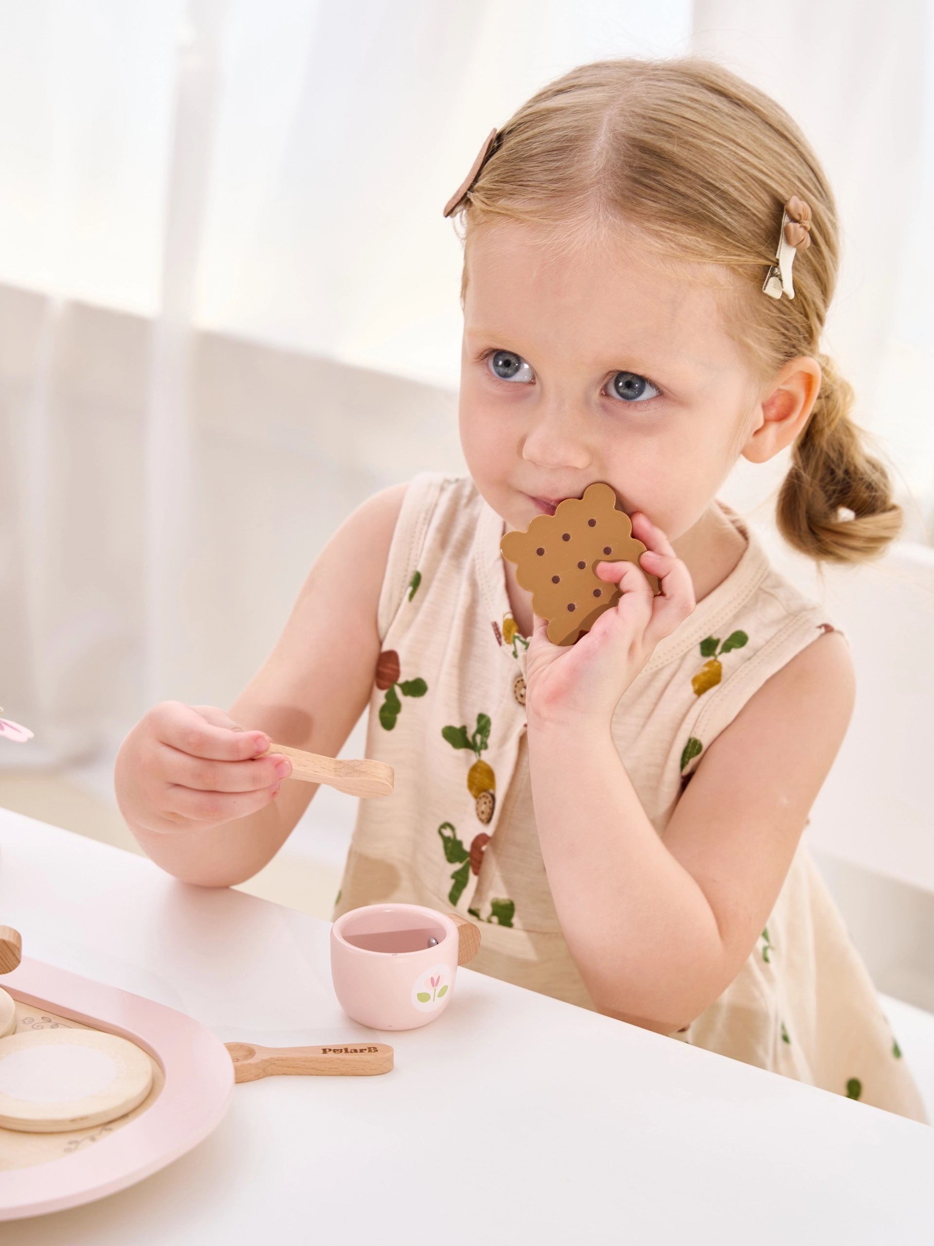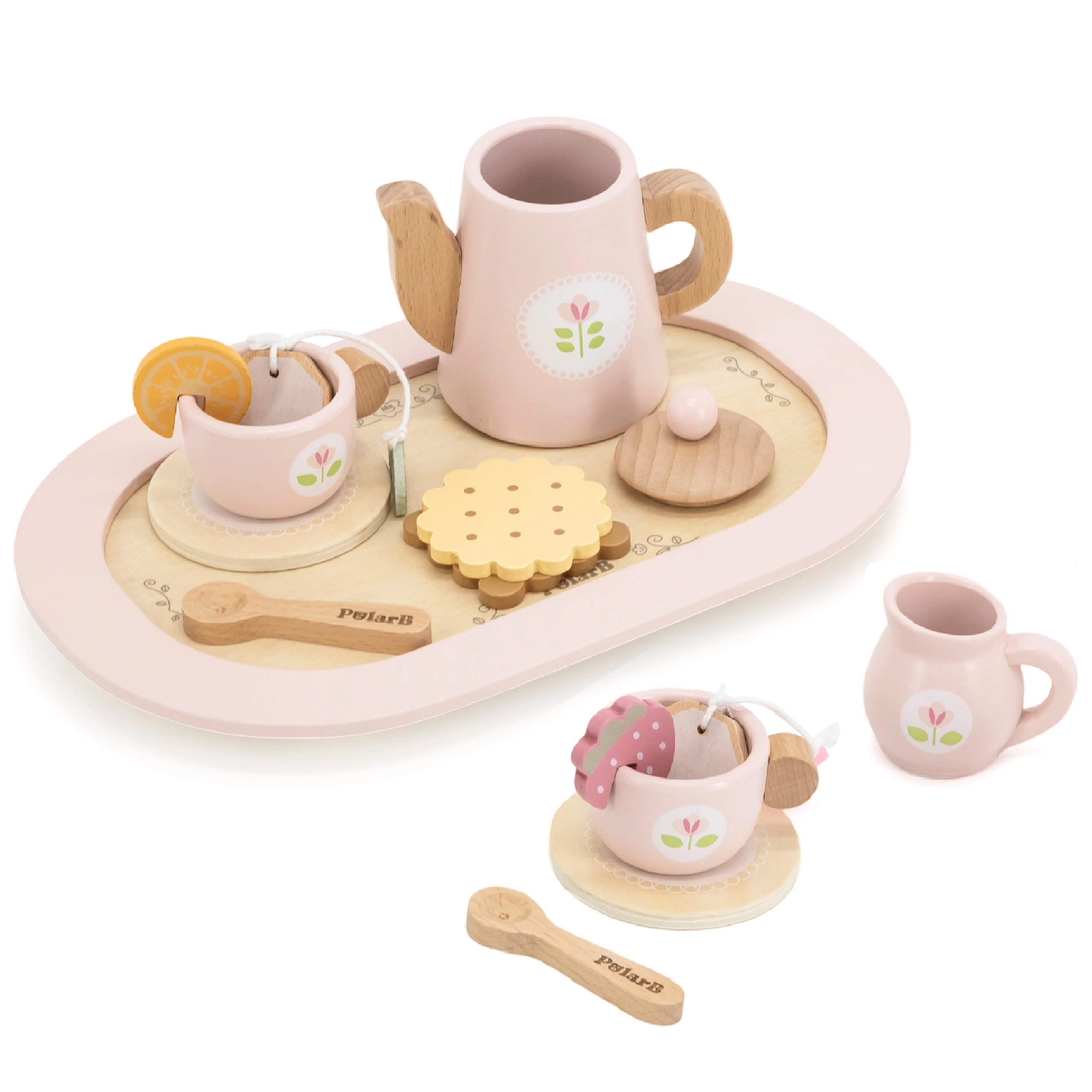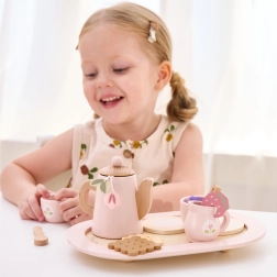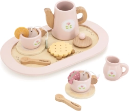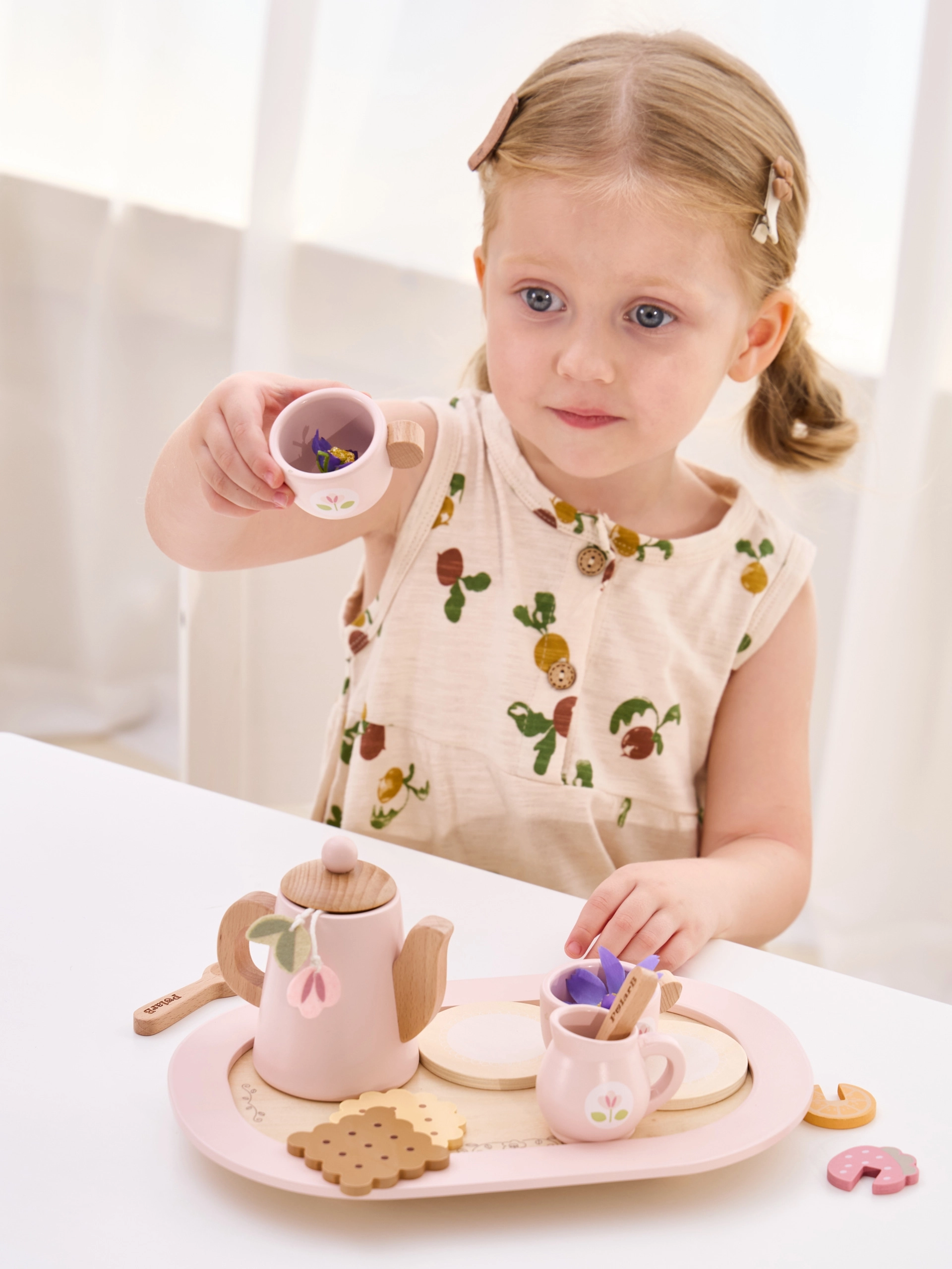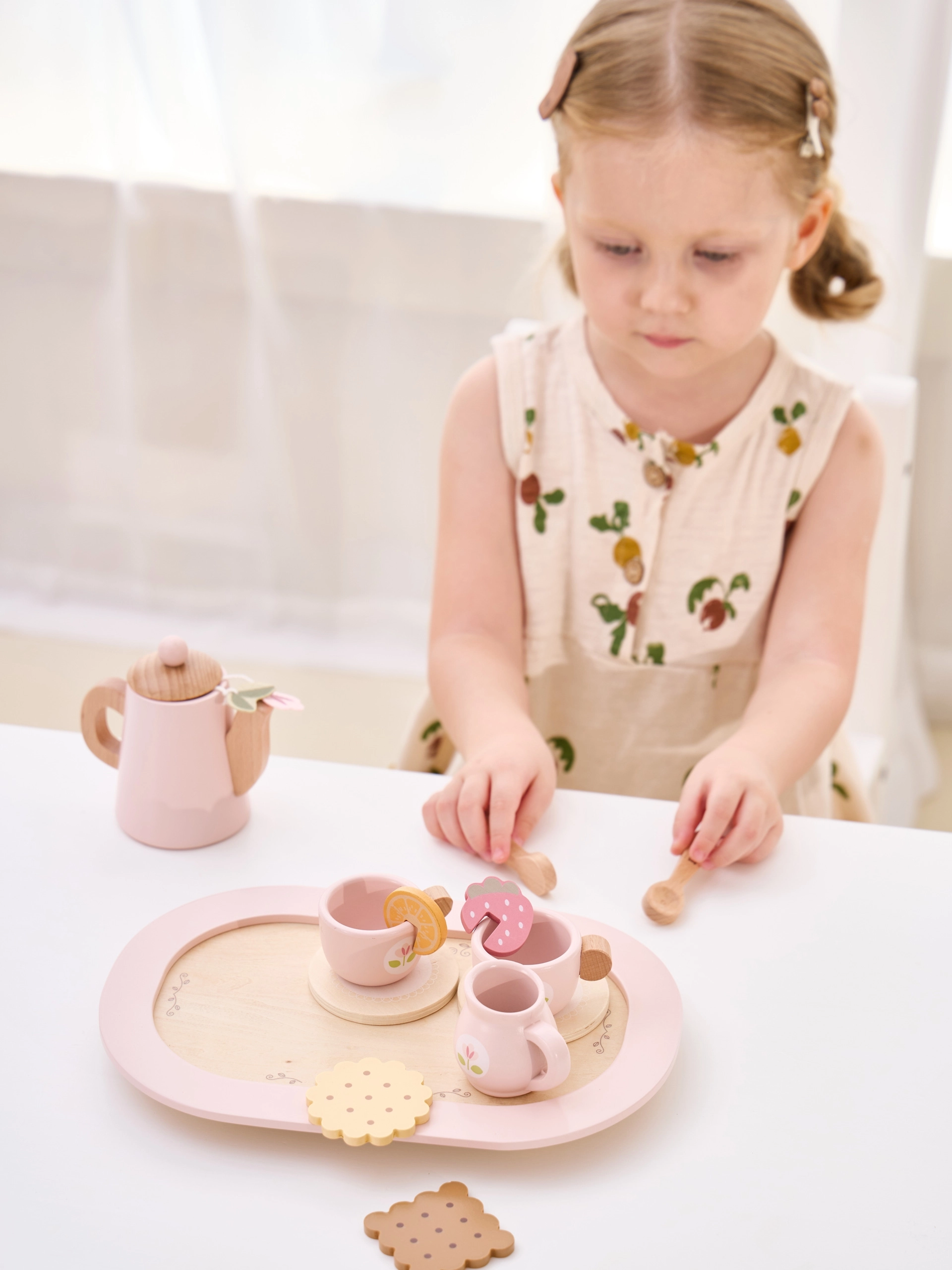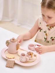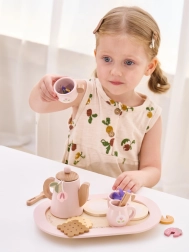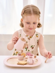 El conjunto ofrece todo lo necesario para servir: tetera con tapa, tazas con platillos, jarrita para leche, cucharitas, bolsitas de té, rodajas de fruta y aromáticas “galletas”, todo ello en una práctica bandeja. Por la composición de las piezas, es un excelente complemento para una habitación infantil de estilo Montessori y también un bonito regalo que encantará a cualquier pequeño anfitrión.