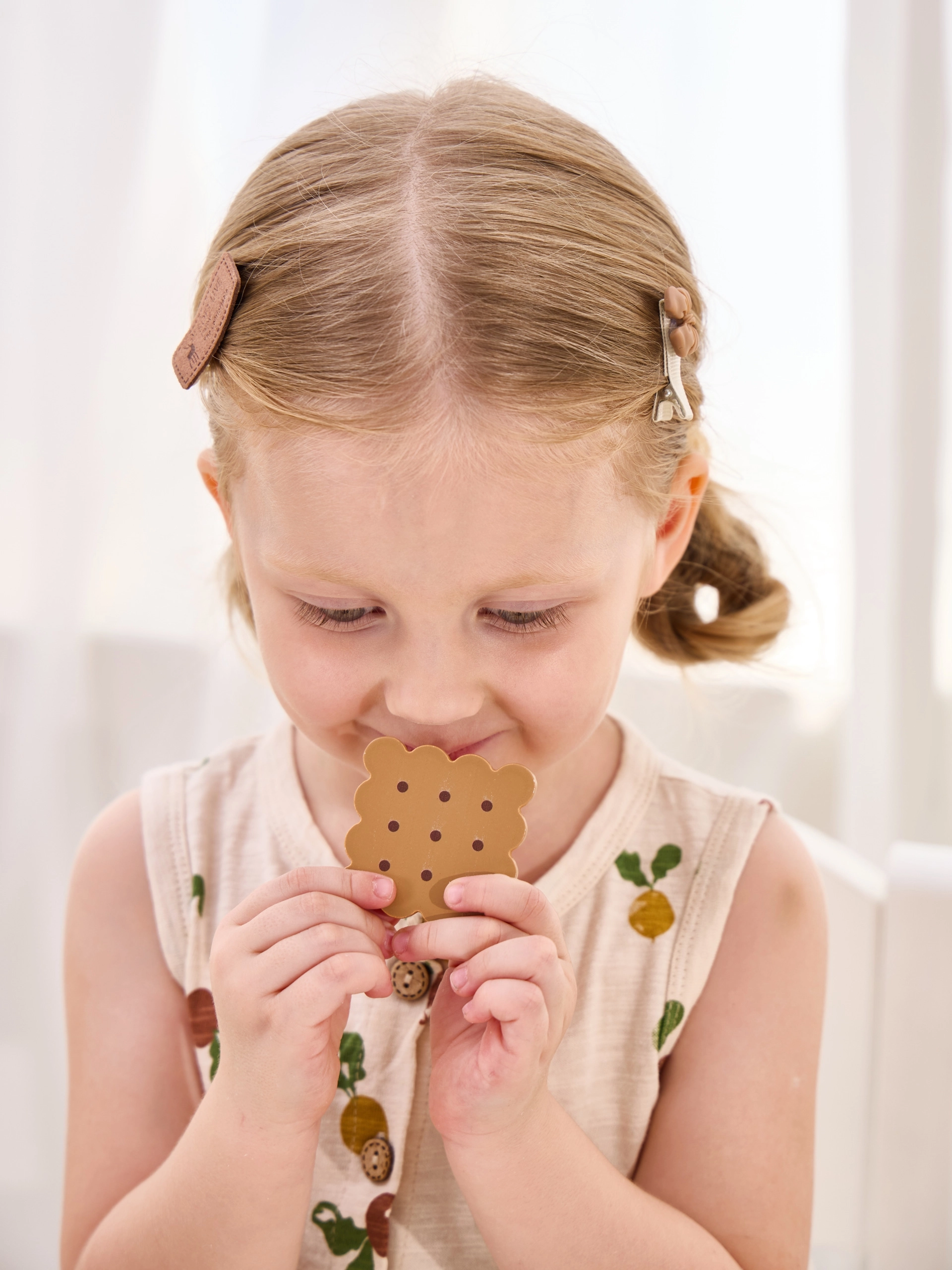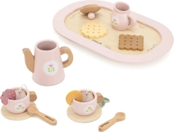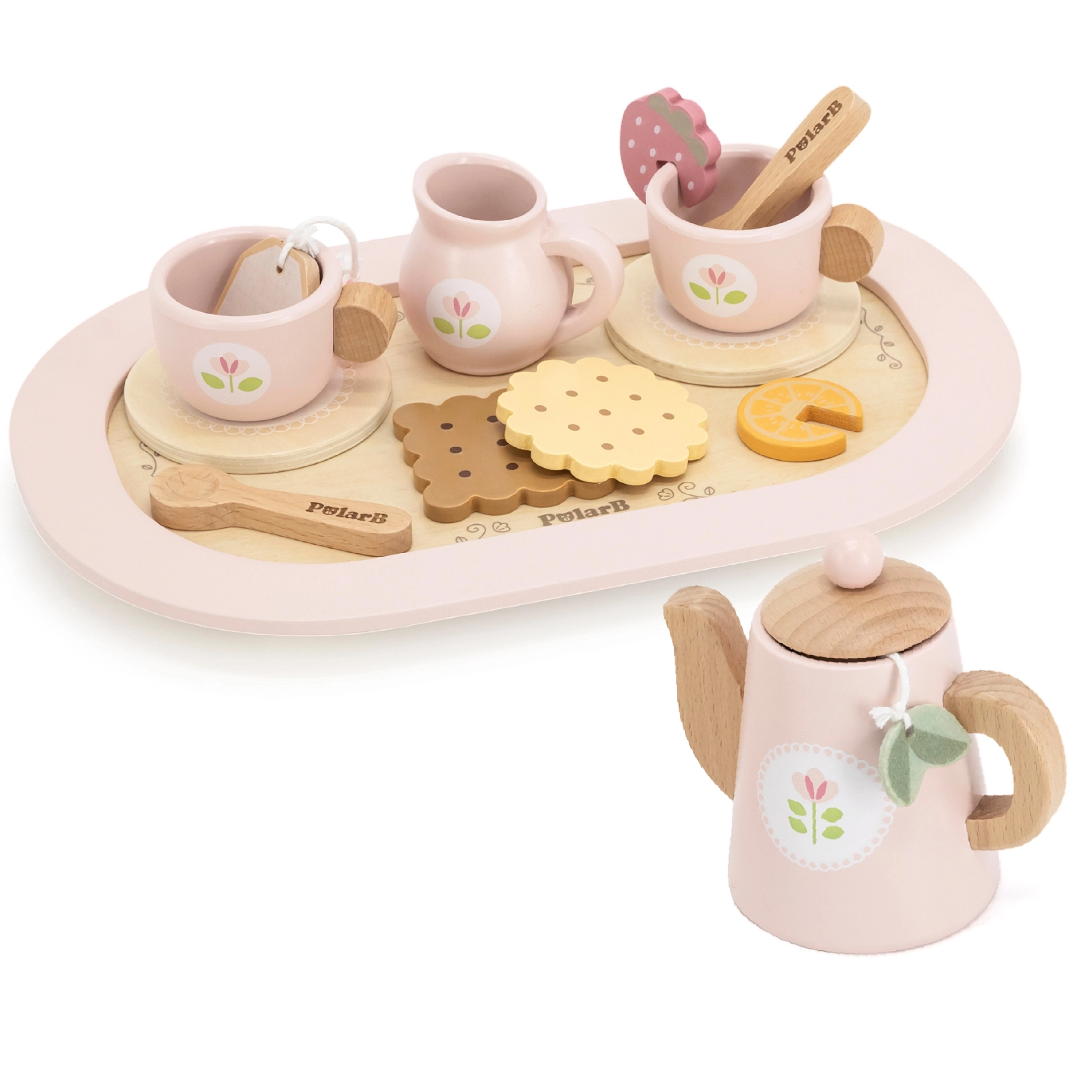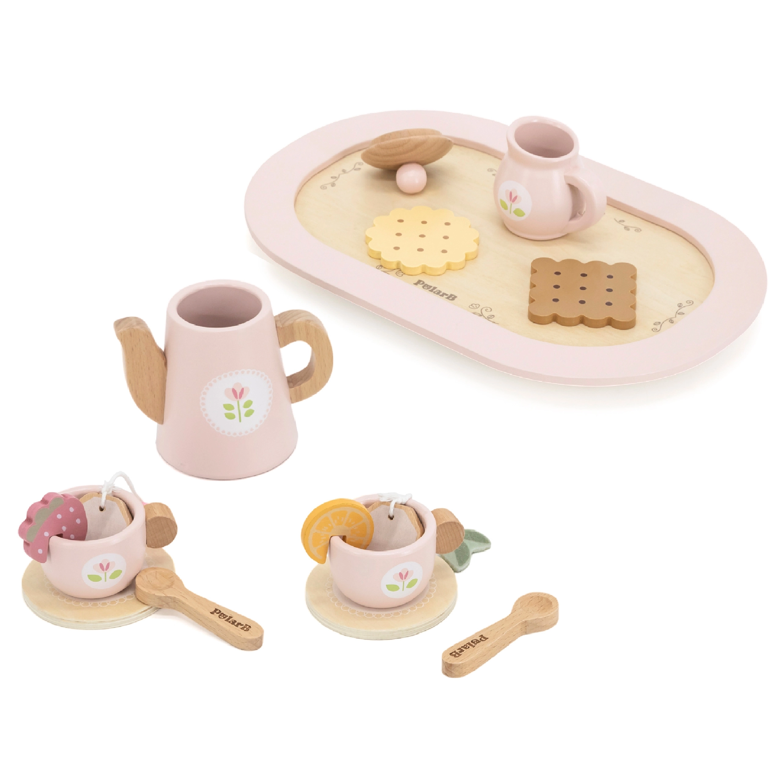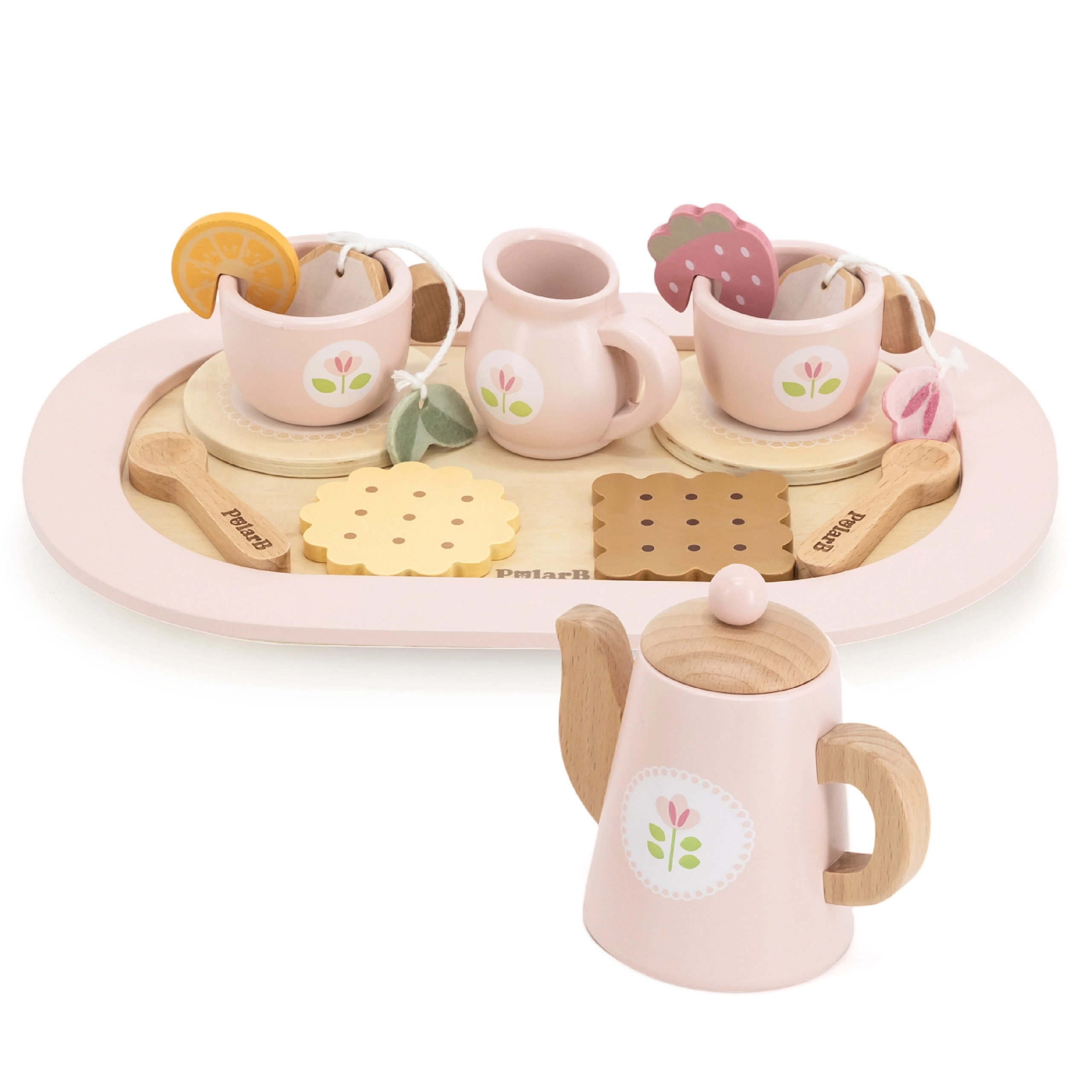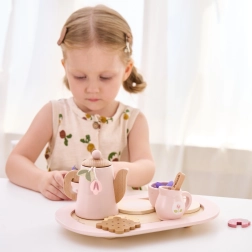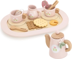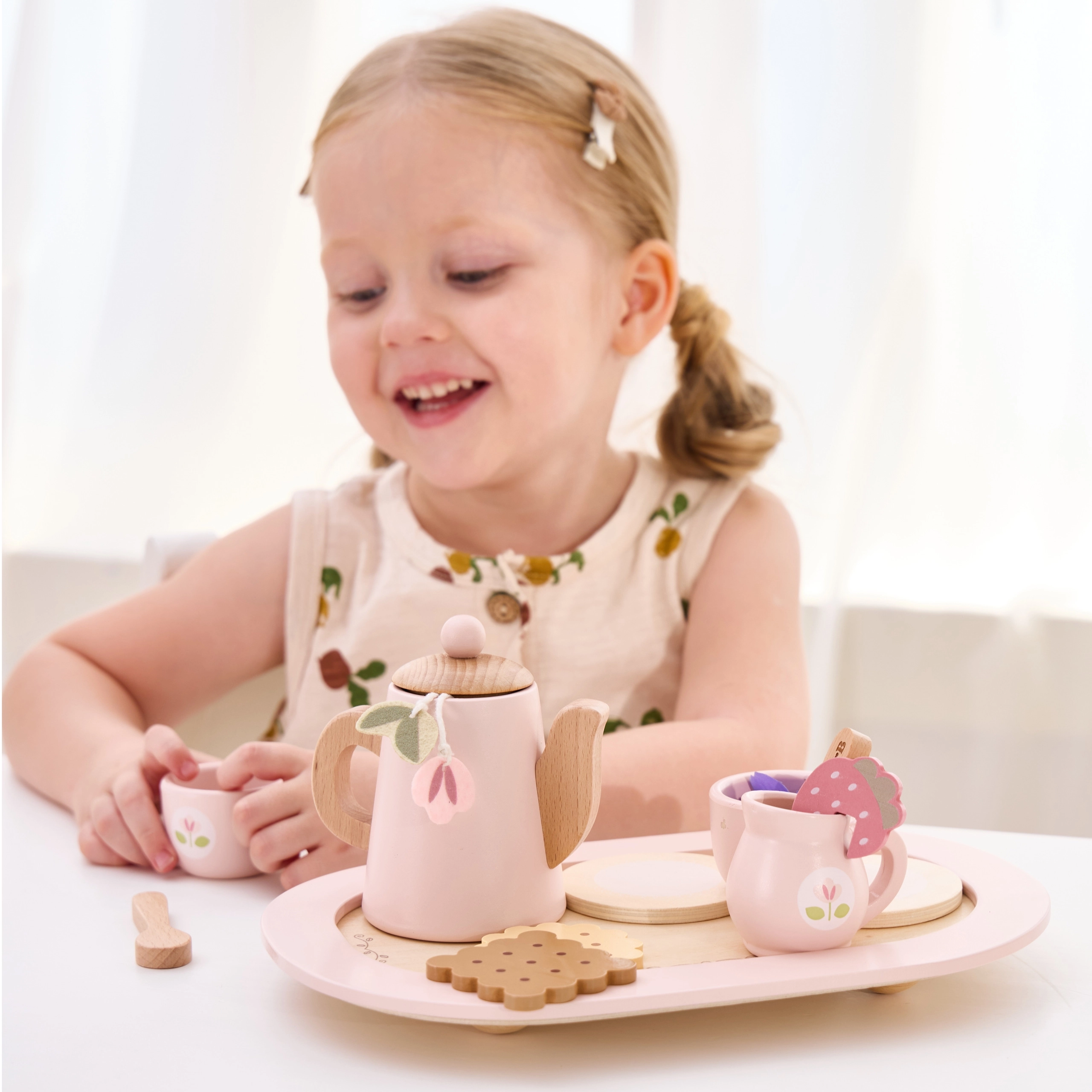 El conjunto ofrece todo lo necesario para servir: tetera con tapa, tazas con platillos, jarrita para leche, cucharitas, bolsitas de té, rodajas de fruta y aromáticas “galletas”, todo ello en una práctica bandeja. Por la composición de las piezas, es un excelente complemento para una habitación infantil de estilo Montessori y también un bonito regalo que encantará a cualquier pequeño anfitrión.