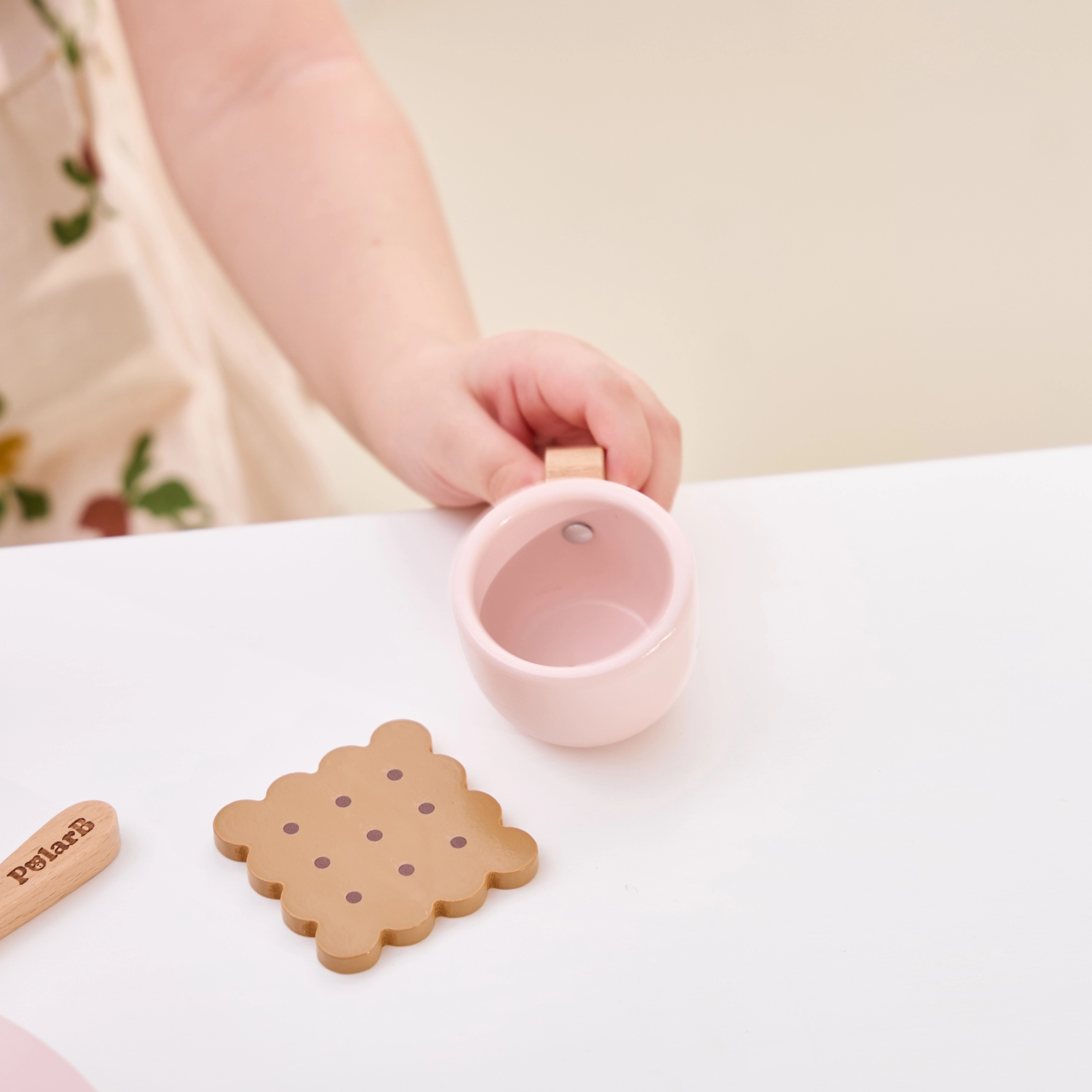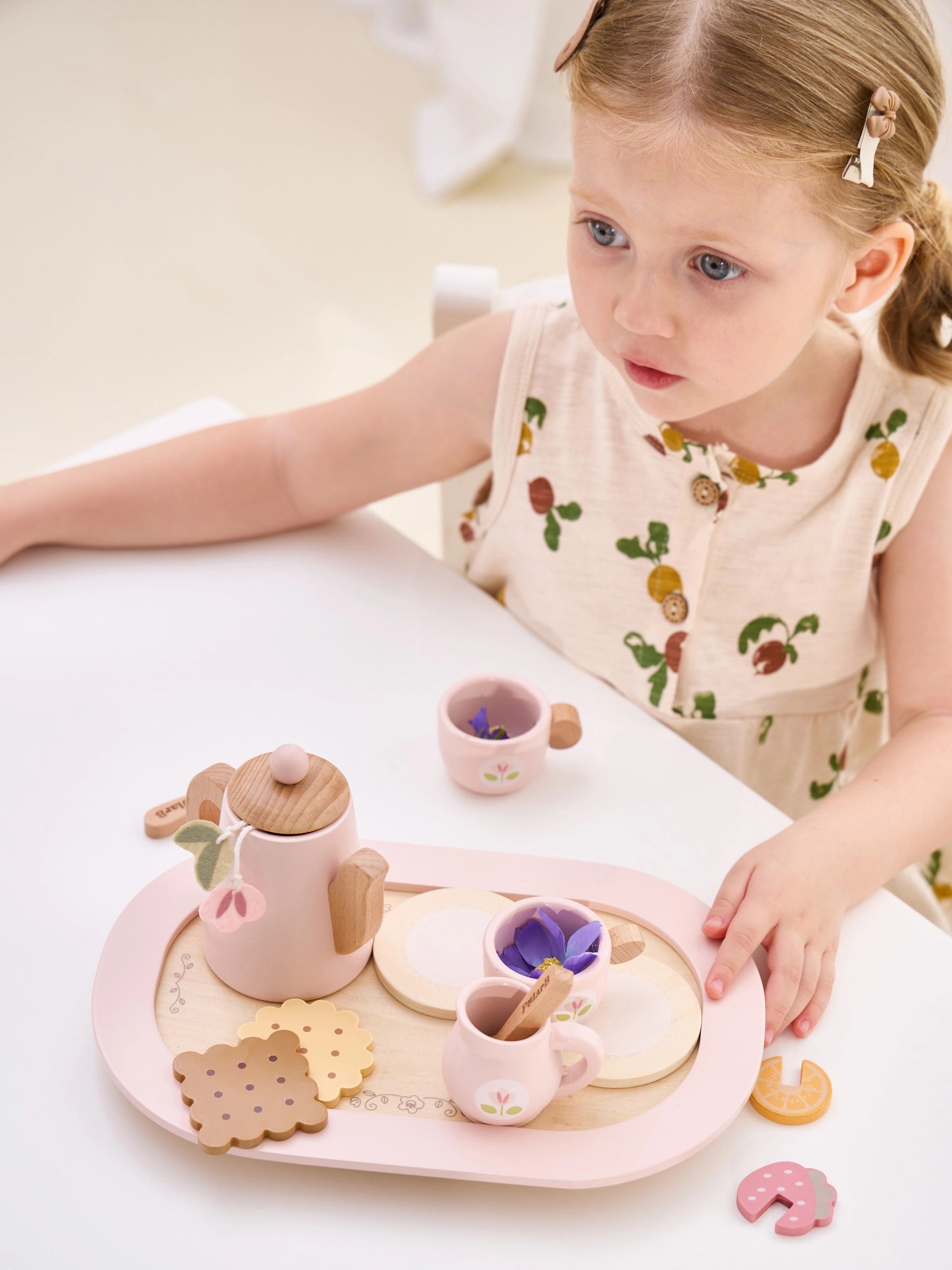 Este elegante set de té infantil de la línea POLARB está diseñado en agradables tonos pastel con detalles florales y anima a compartir meriendas de té. La madera es agradable al tacto, las piezas se adaptan a las manos de los niños y resisten el juego diario. Los pequeños practican la motricidad fina, aprenden cortesía y cooperación y desarrollan la imaginación mediante el juego simbólico.